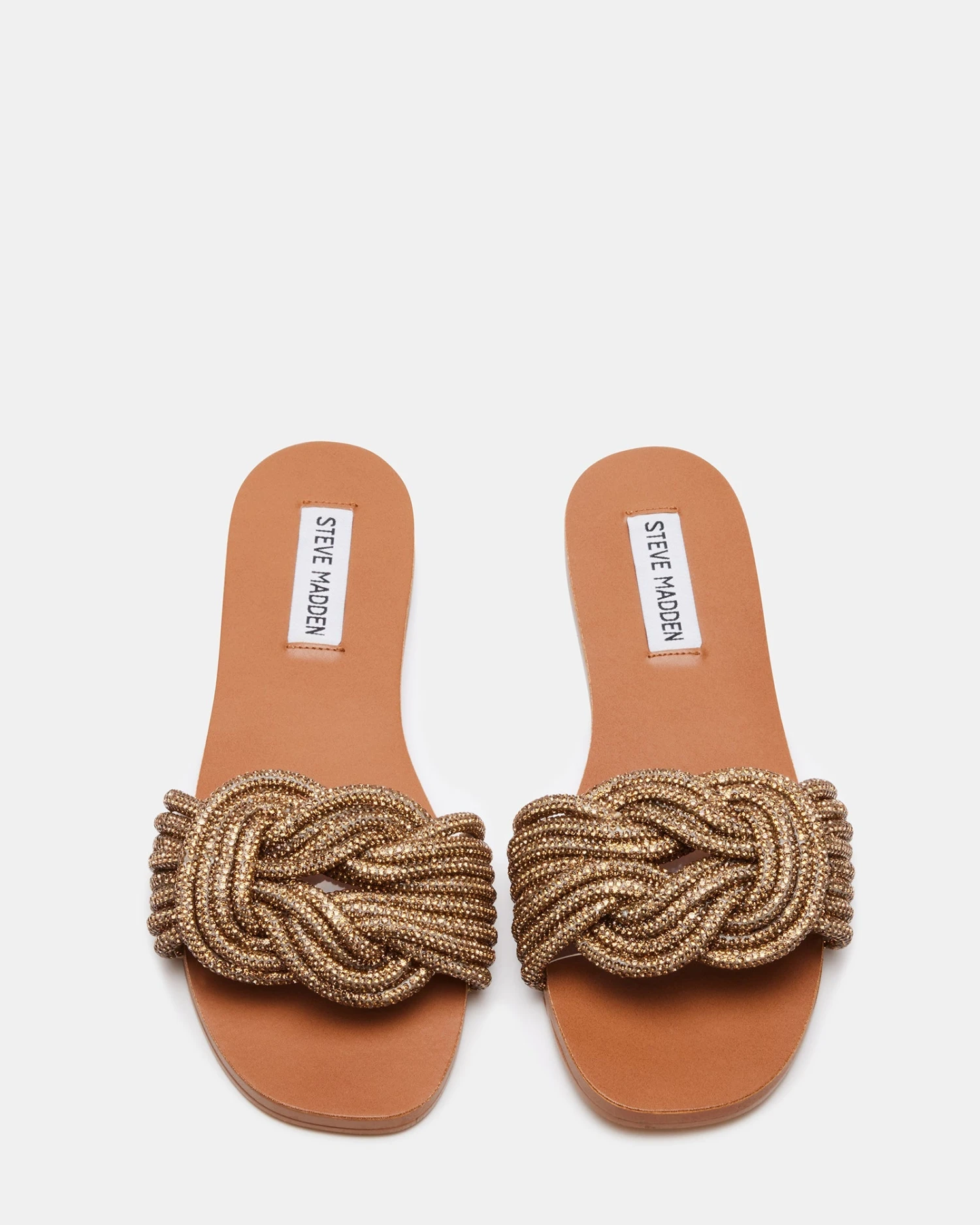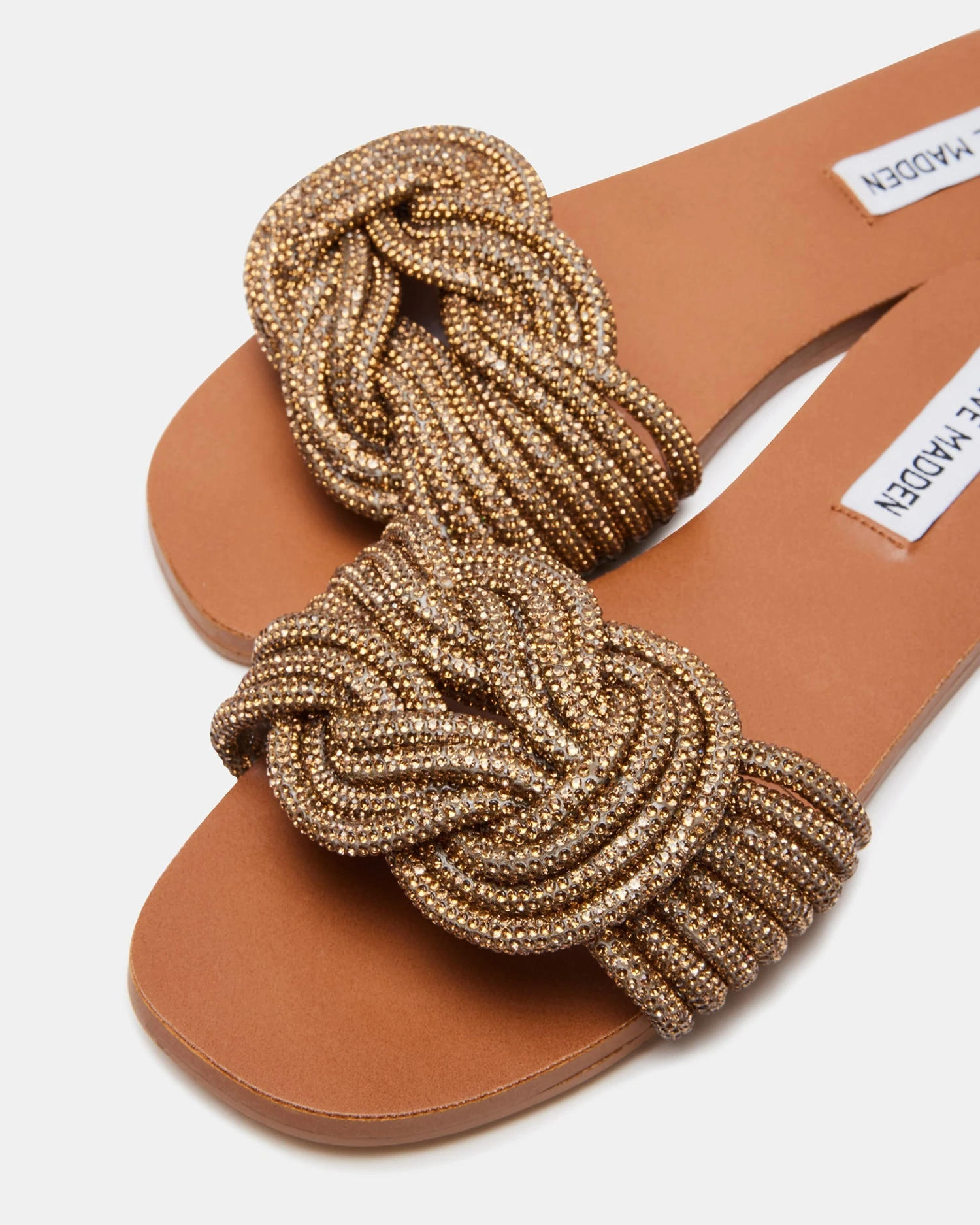 The ADORE sandals are a flat slide design with a wide front strap made up of shimmering embellished cords in a flat square knot.