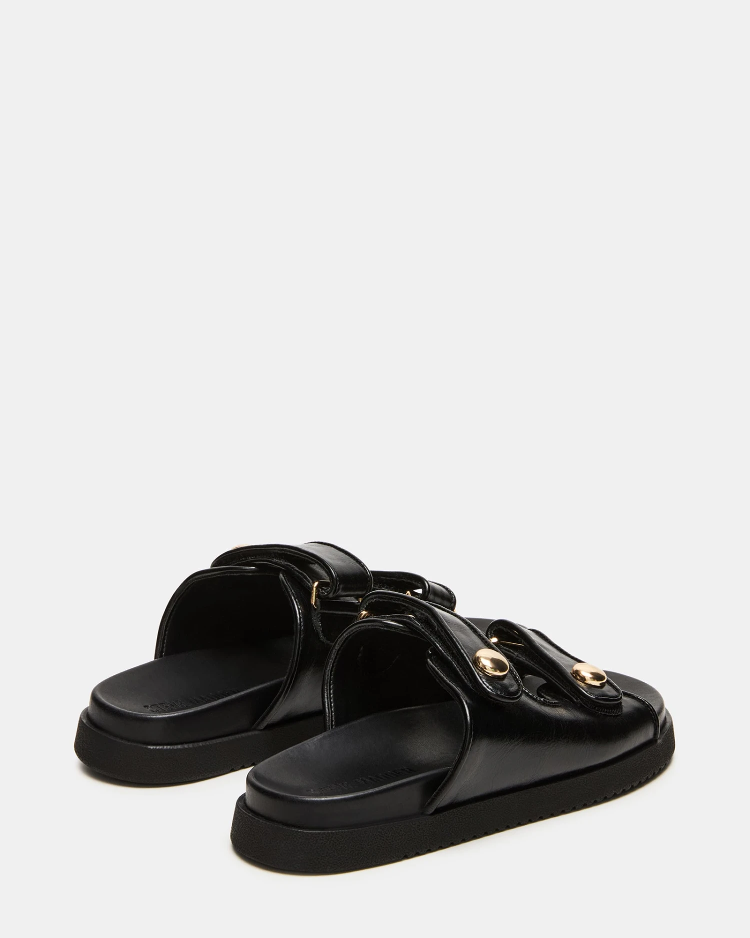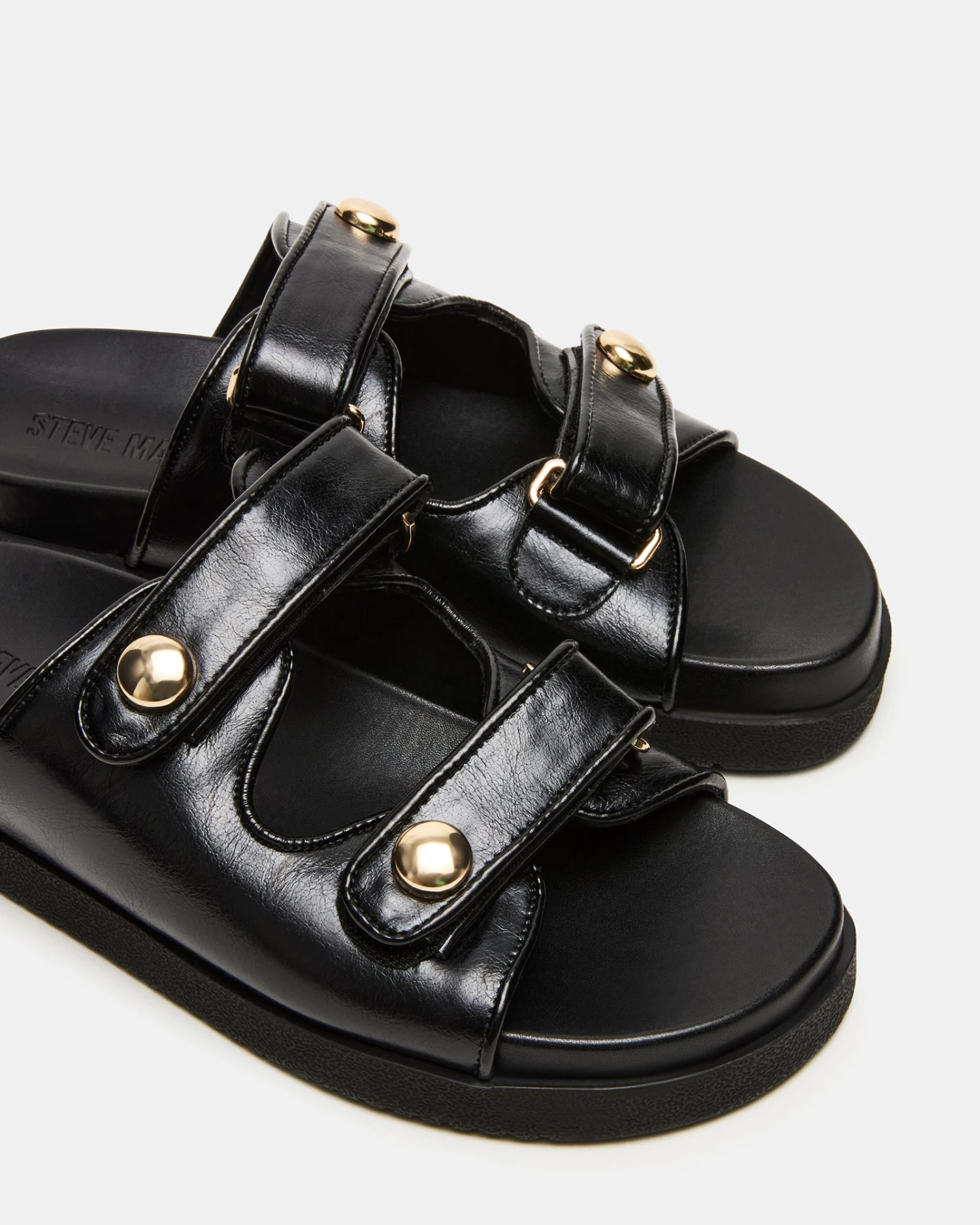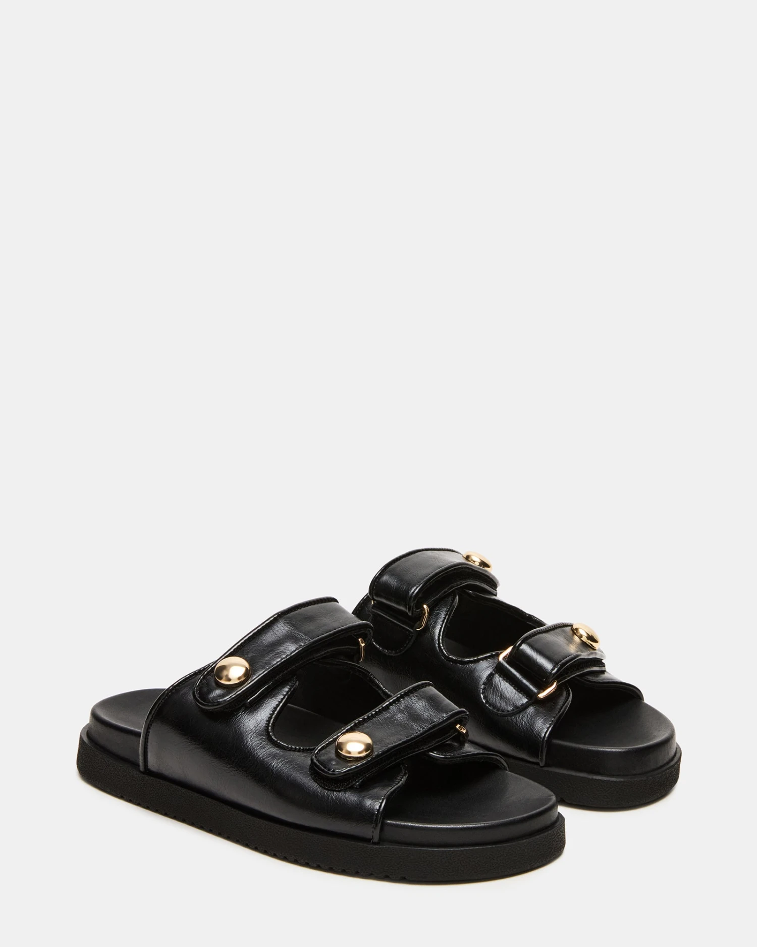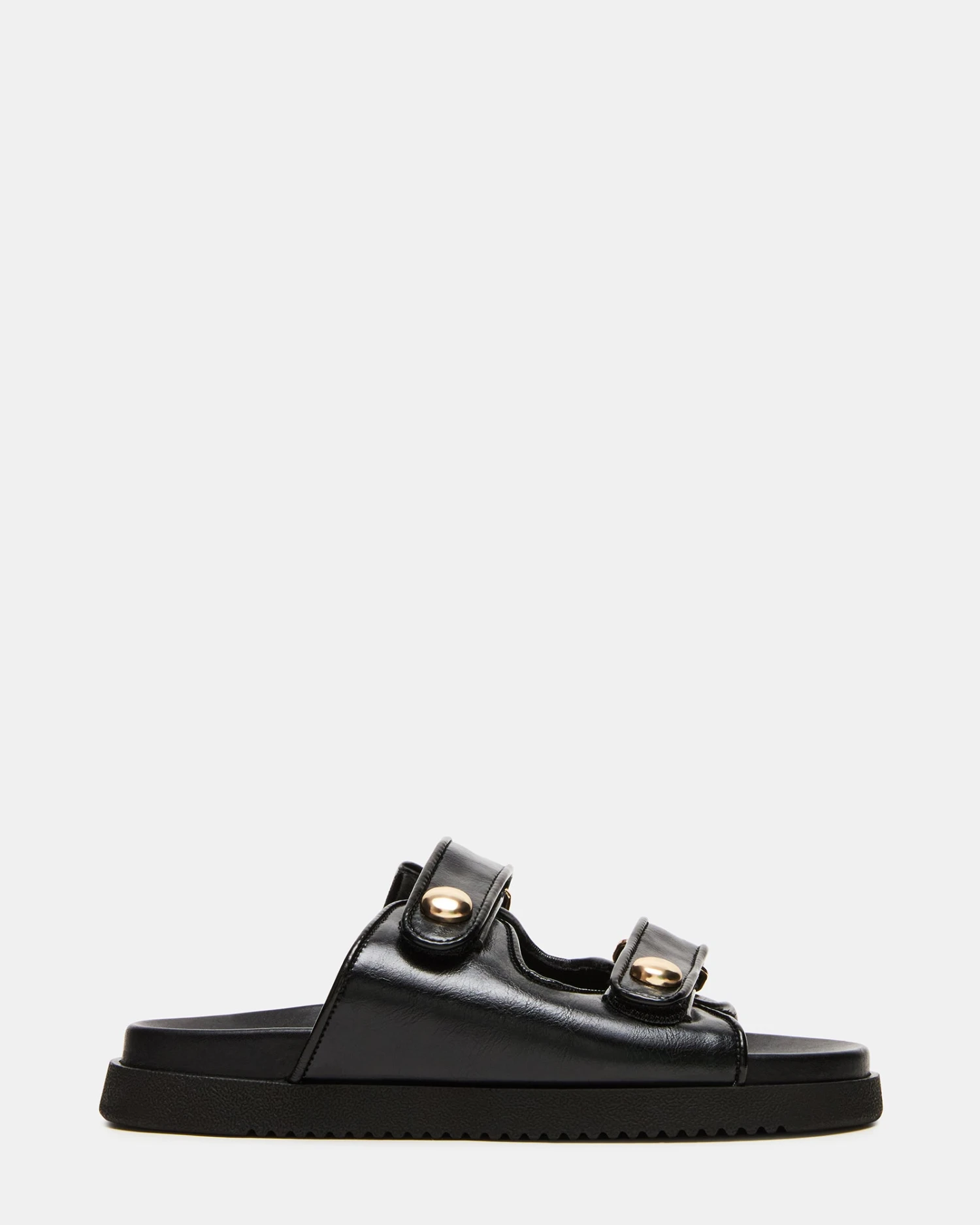 The ATHENS BLACK LEATHER sandal features a cushioned footbed designed for all-day comfort paired with a modern flatform sole that provides subtle height without compromising stability. Crafted in sleek materials, this slide offers a versatile look that seamlessly transitions from casual outings to elevated summer styles. Its minimalist design emphasizes both function and contemporary appeal, making it a refined choice for those seeking effortless sophistication in their footwear.