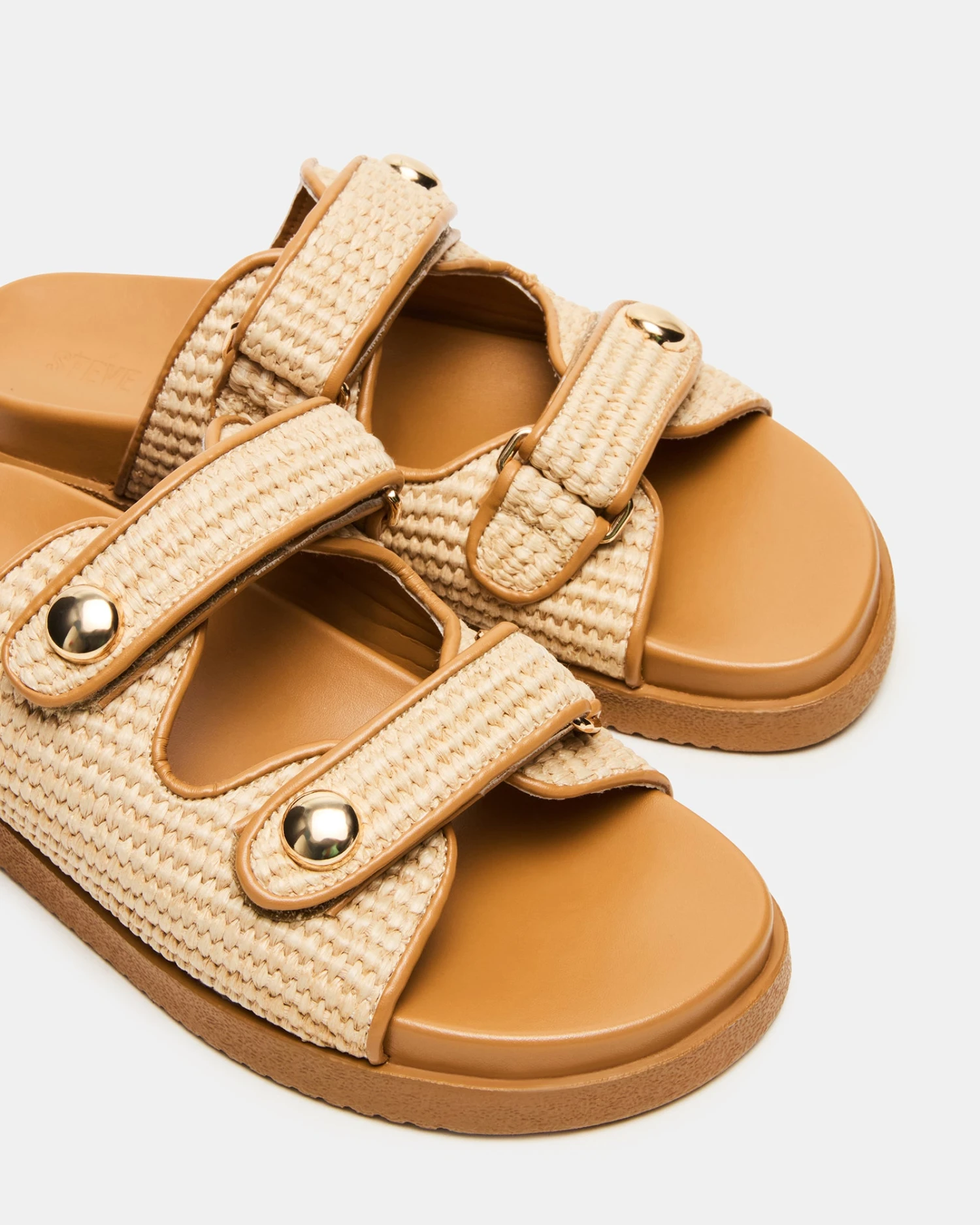 The ATHENS NATURAL RAFFIA sandal features a cushioned footbed designed for all-day comfort paired with a modern flatform sole that provides subtle height without compromising stability. Crafted in sleek materials, this slide offers a versatile look that seamlessly transitions from casual outings to elevated summer styles. Its minimalist design emphasizes both function and contemporary appeal, making it a refined choice for those seeking effortless sophistication in their footwear.