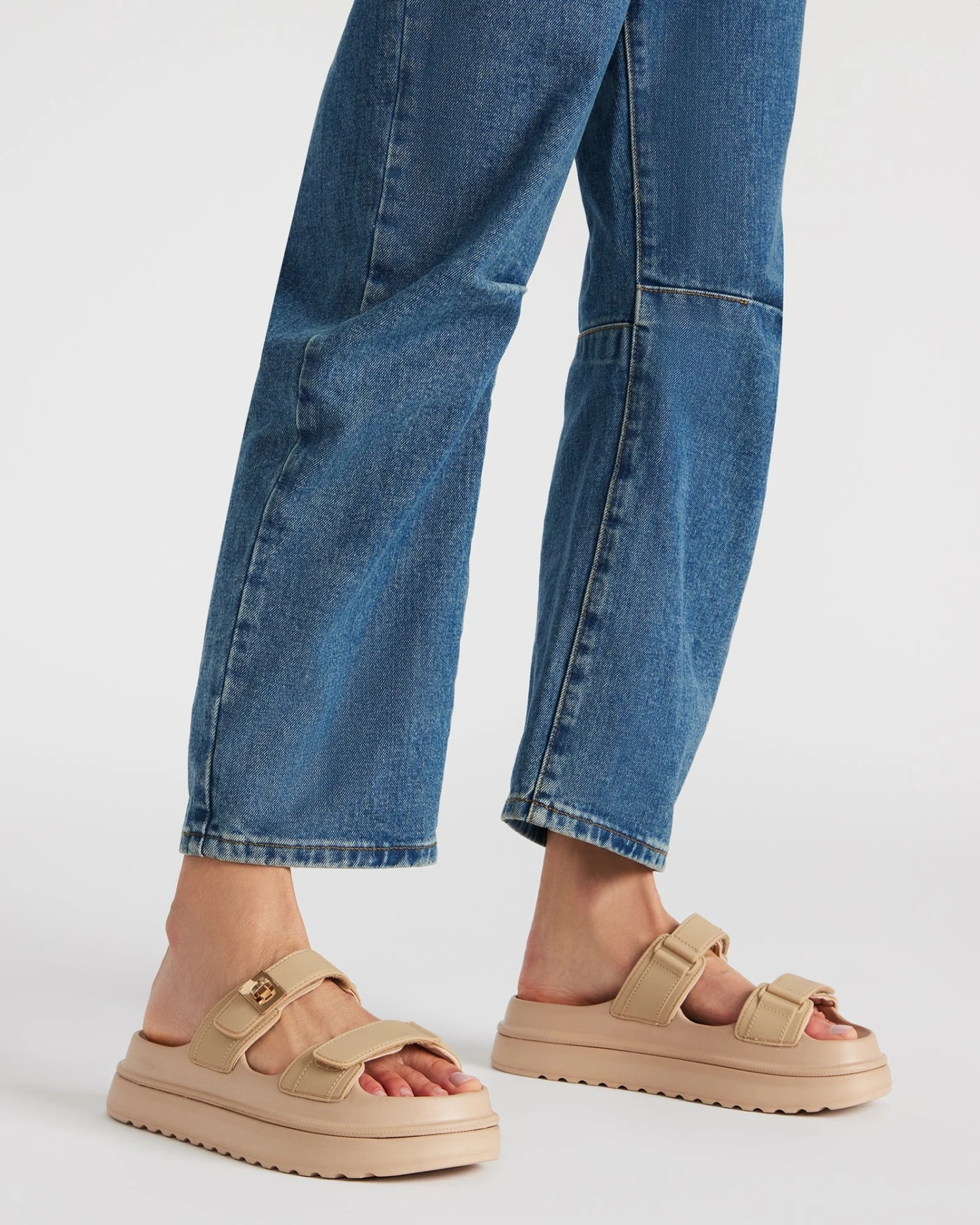 Elevate your style with the BIGSCHMONA JELLY platform slide sandal. The flatform design provides a modern twist while the turn-lock hardware accent adds a touch of sophistication. Step up your fashion game while enjoying the comfort and stability of this versatile shoe.