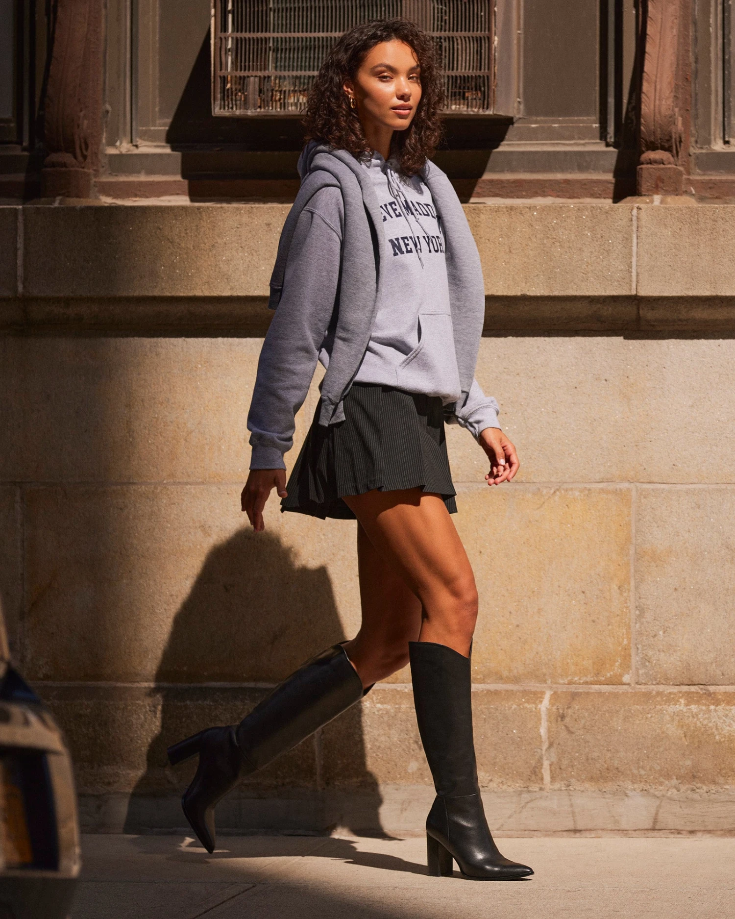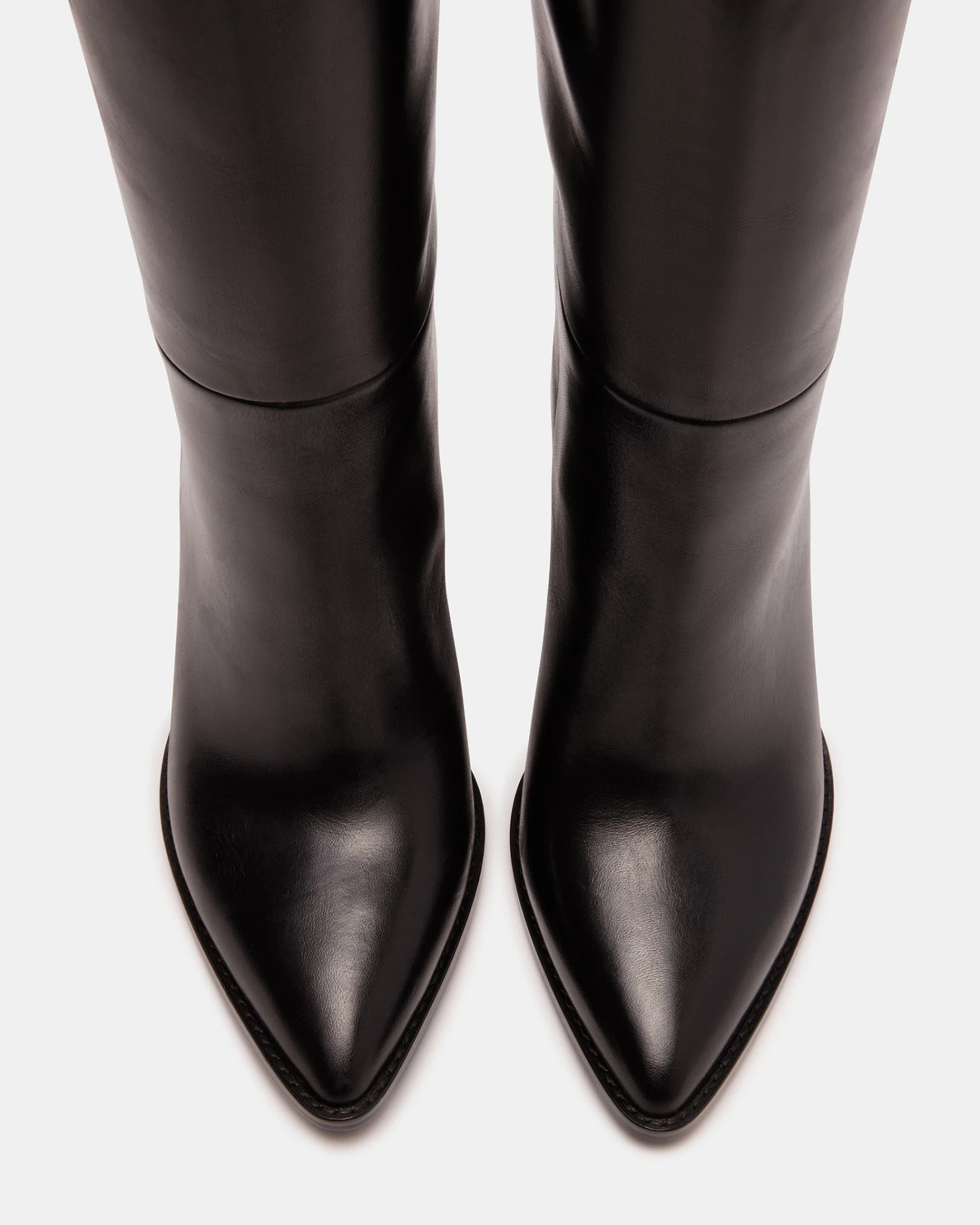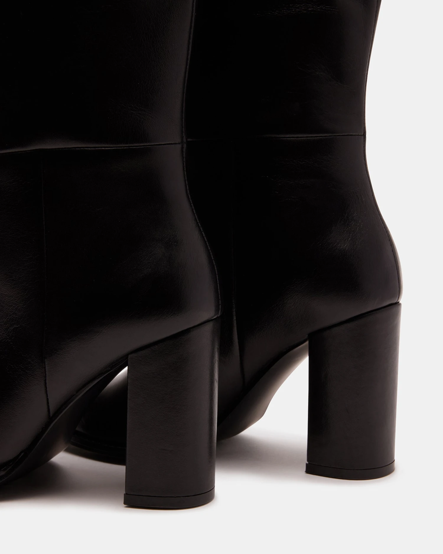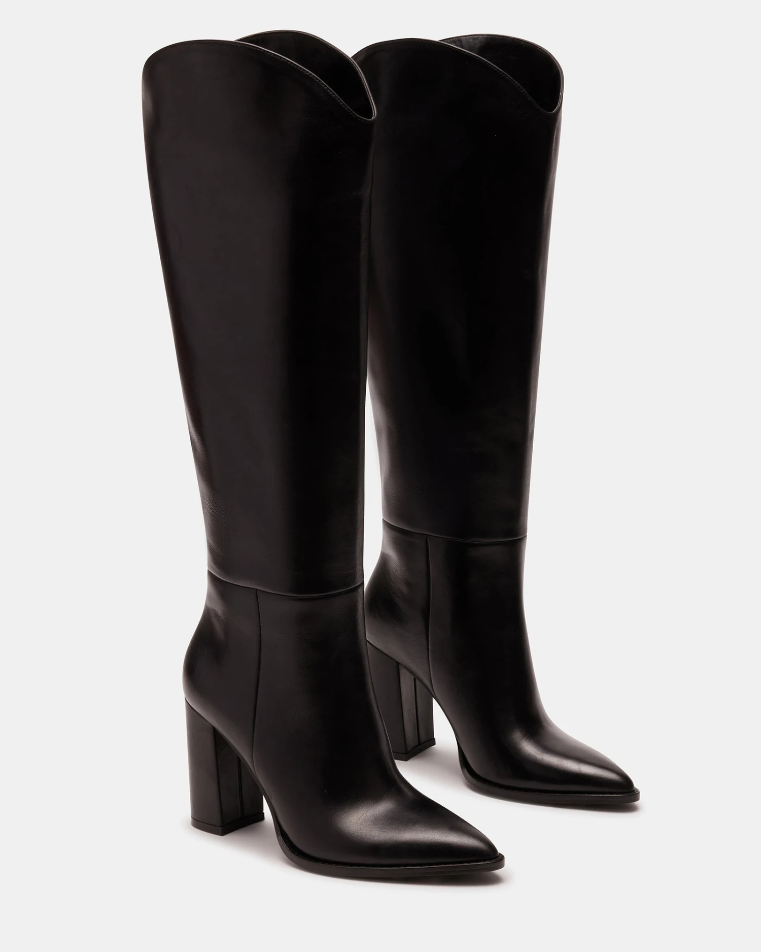 A pointed toe and curved topline give the BIXBY block heel knee boot a Western edge while the sleek upper highlights the clean monochrome look