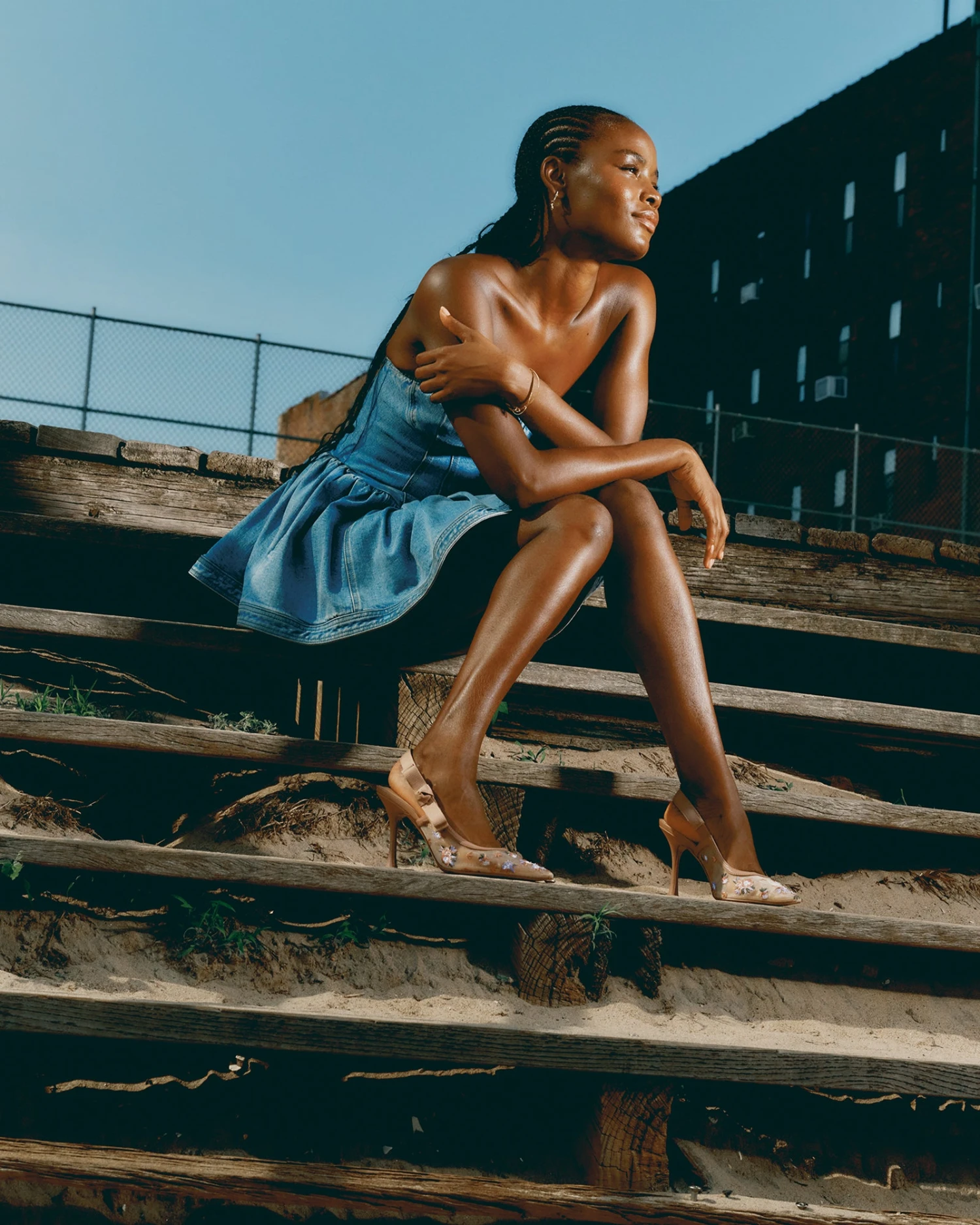 A grosgrain ribbon wraps around the slingback strap of the BRI point toe stiletto pump and finishes with a bow accenting the side of the shoe.