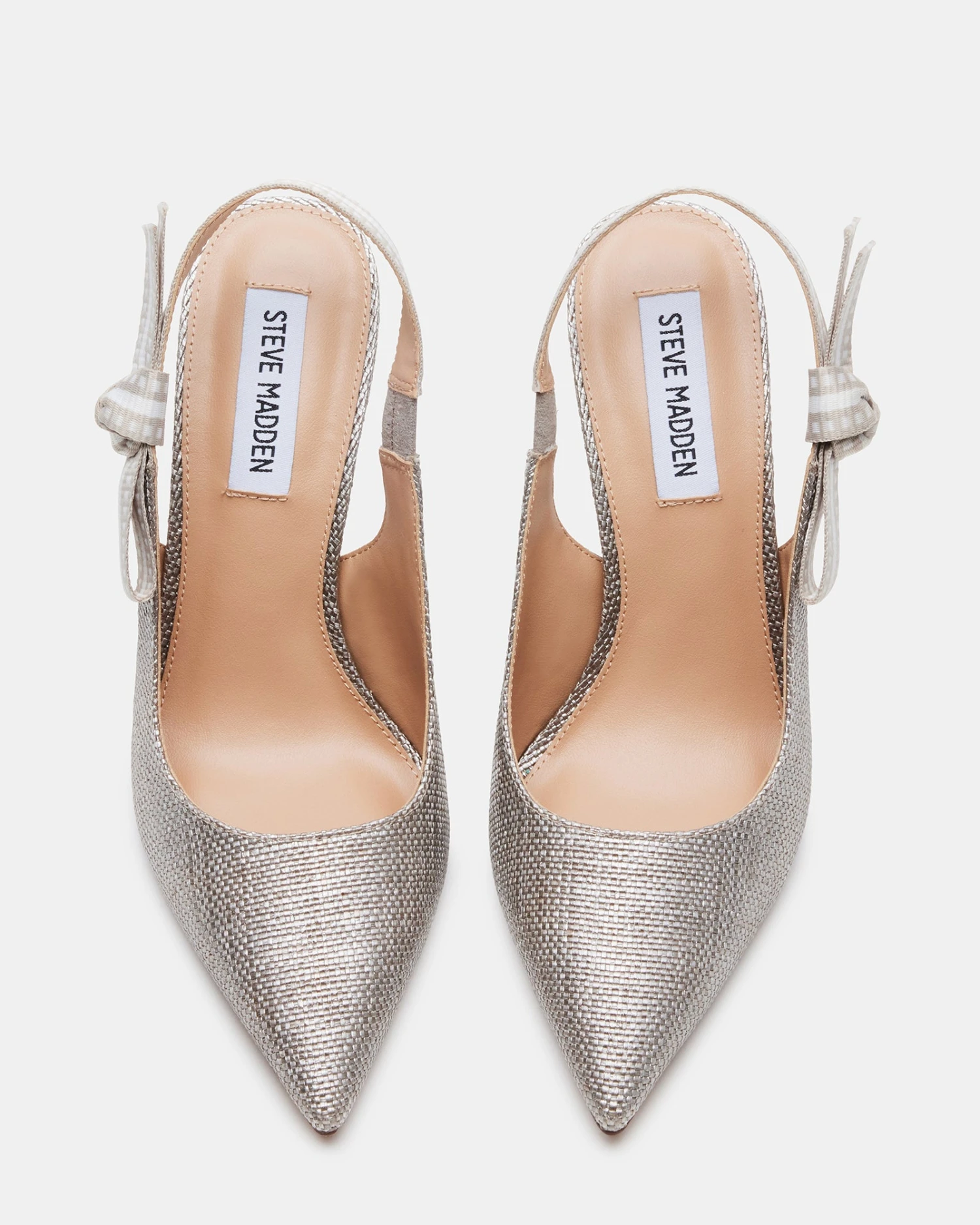 A grosgrain ribbon wraps around the slingback strap of the BRI point toe stiletto pump and finishes with a bow accenting the side of the shoe.
