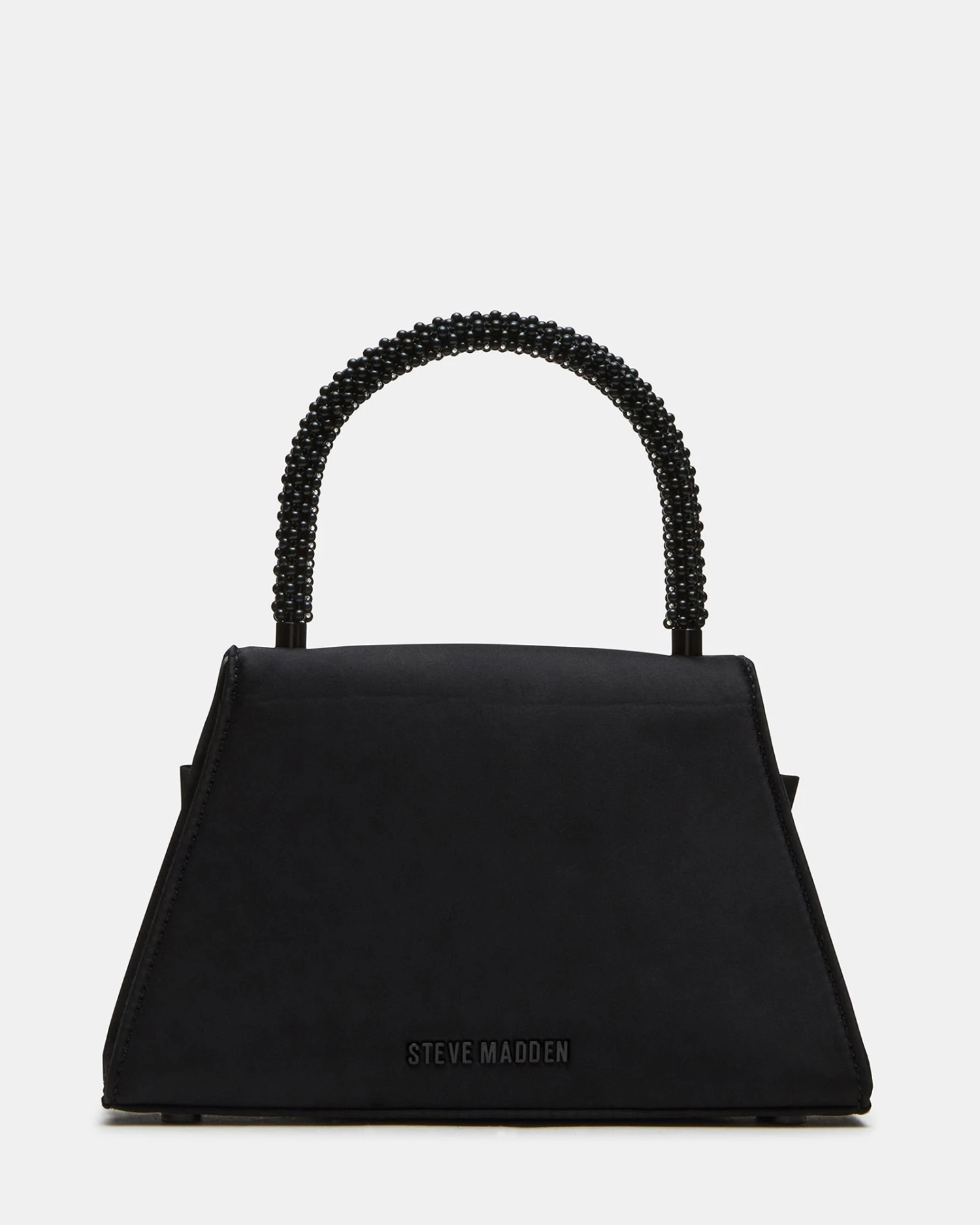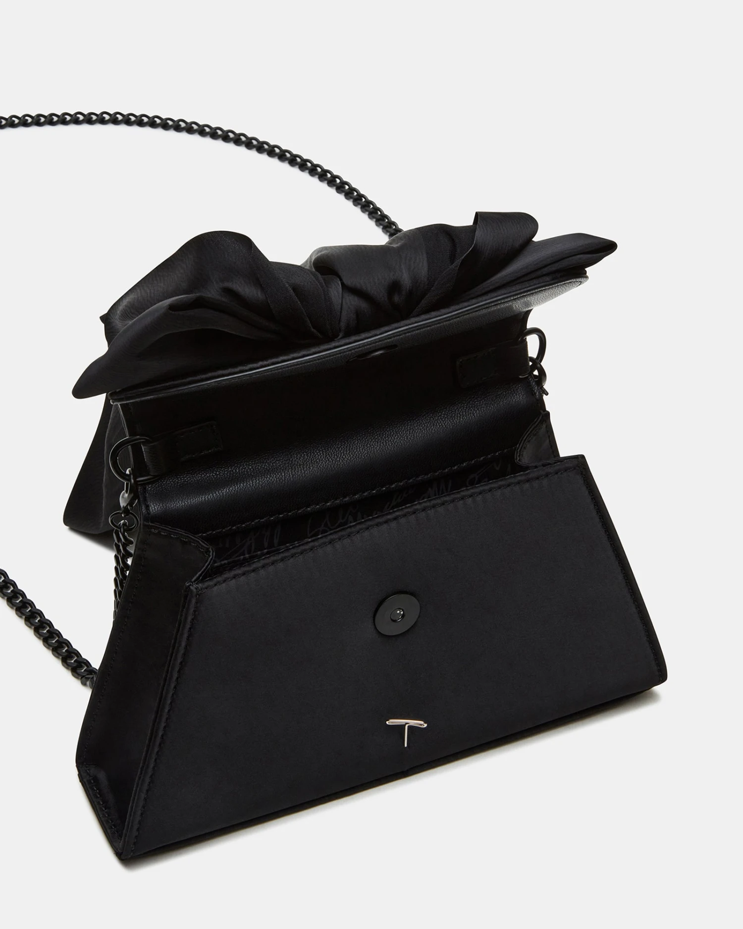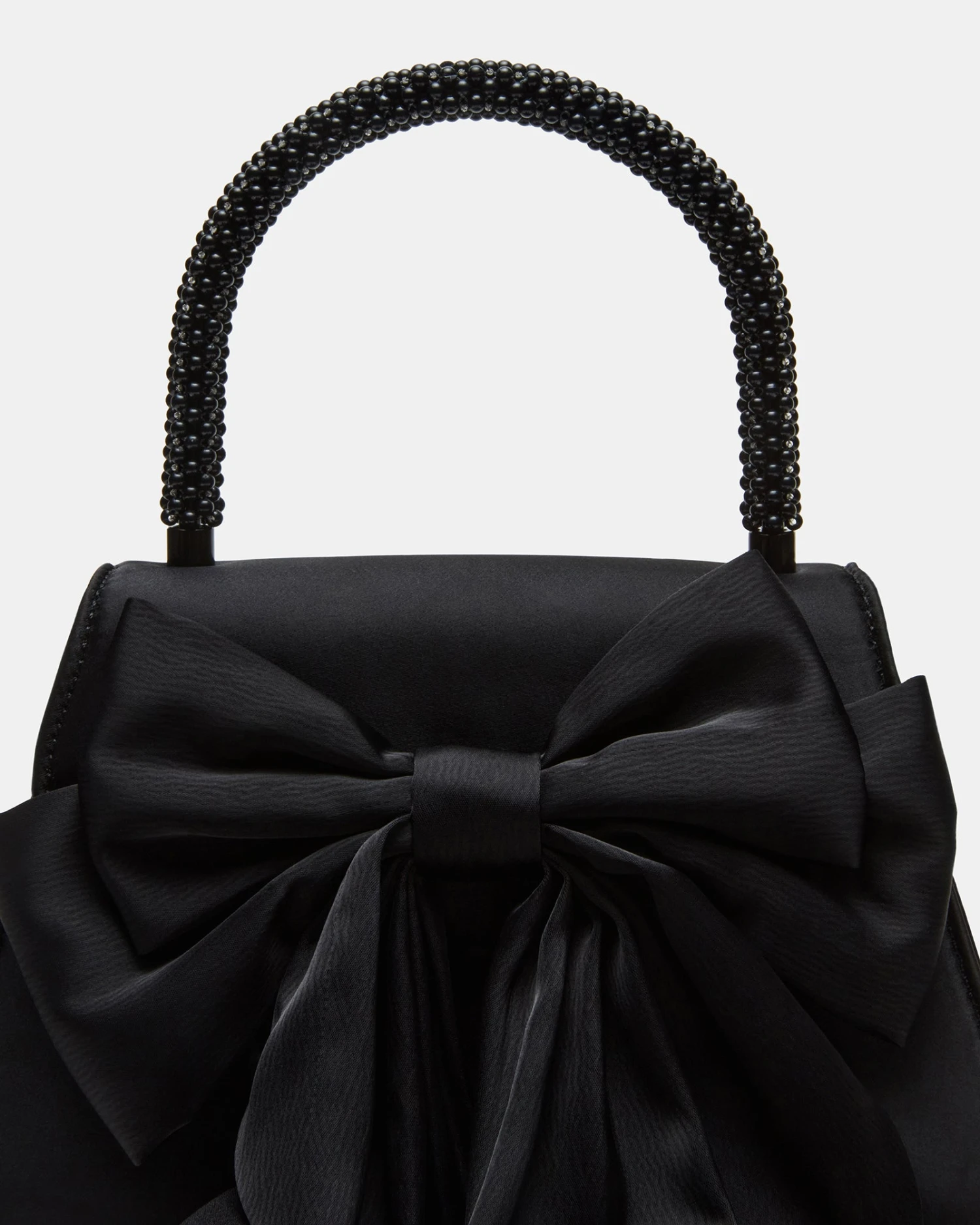 Introducing the sophisticated COSETTE bag. Expertly crafted with smooth satin and a beaded top handle, this elegant bag features a long satin bow and a structured top handle for a touch of glamour. The interior back slit pocket and detachable chain strap add practicality to its angled, trapezoid silhouette. Perfect for any formal occasion, this bag is a must-have for the style-conscious individual.