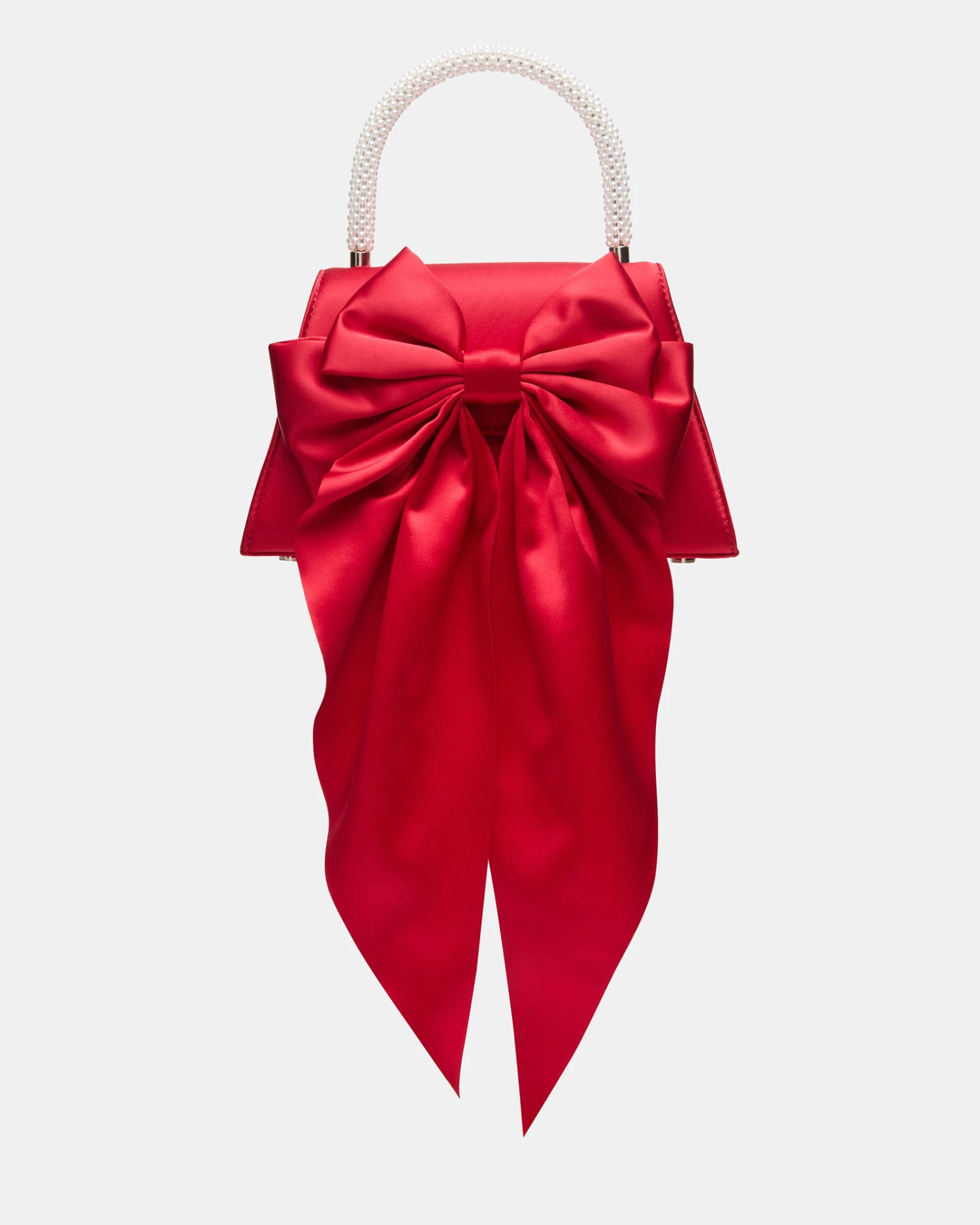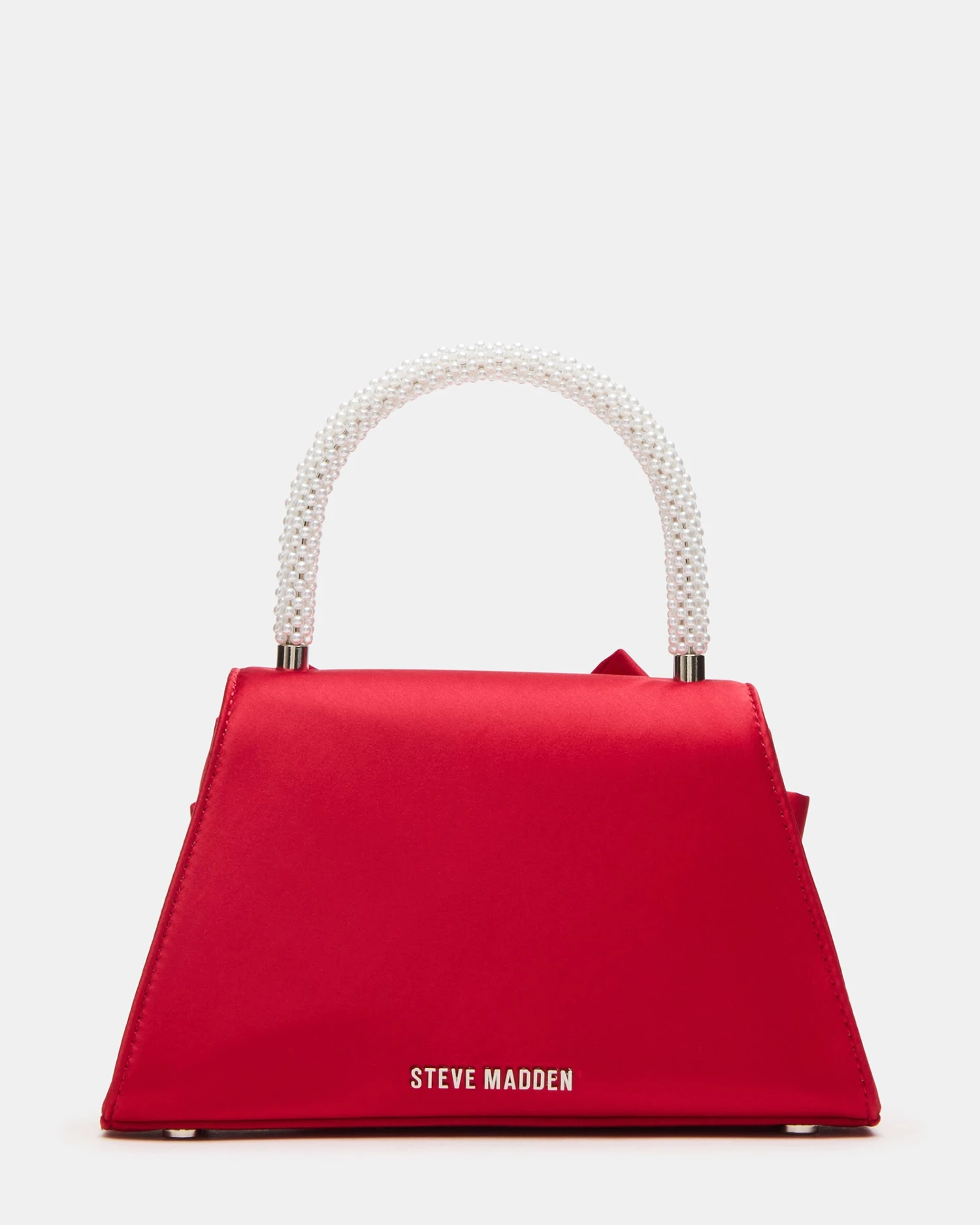 Introducing the sophisticated COSETTE bag. Expertly crafted with smooth satin and a beaded top handle, this elegant bag features a long satin bow and a structured top handle for a touch of glamour. The interior back slit pocket and detachable chain strap add practicality to its angled, trapezoid silhouette. Perfect for any formal occasion, this bag is a must-have for the style-conscious individual.