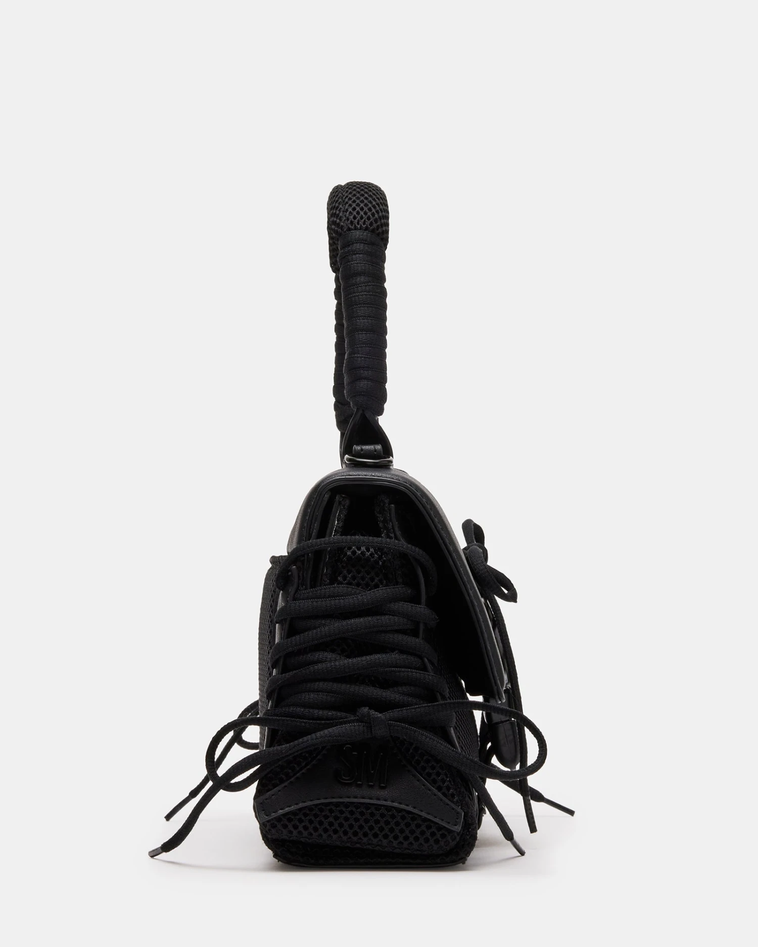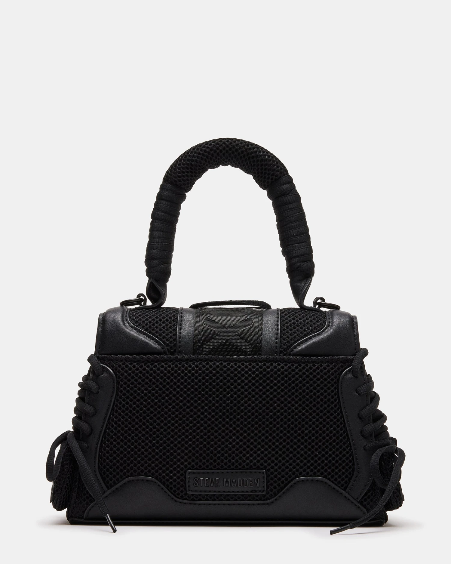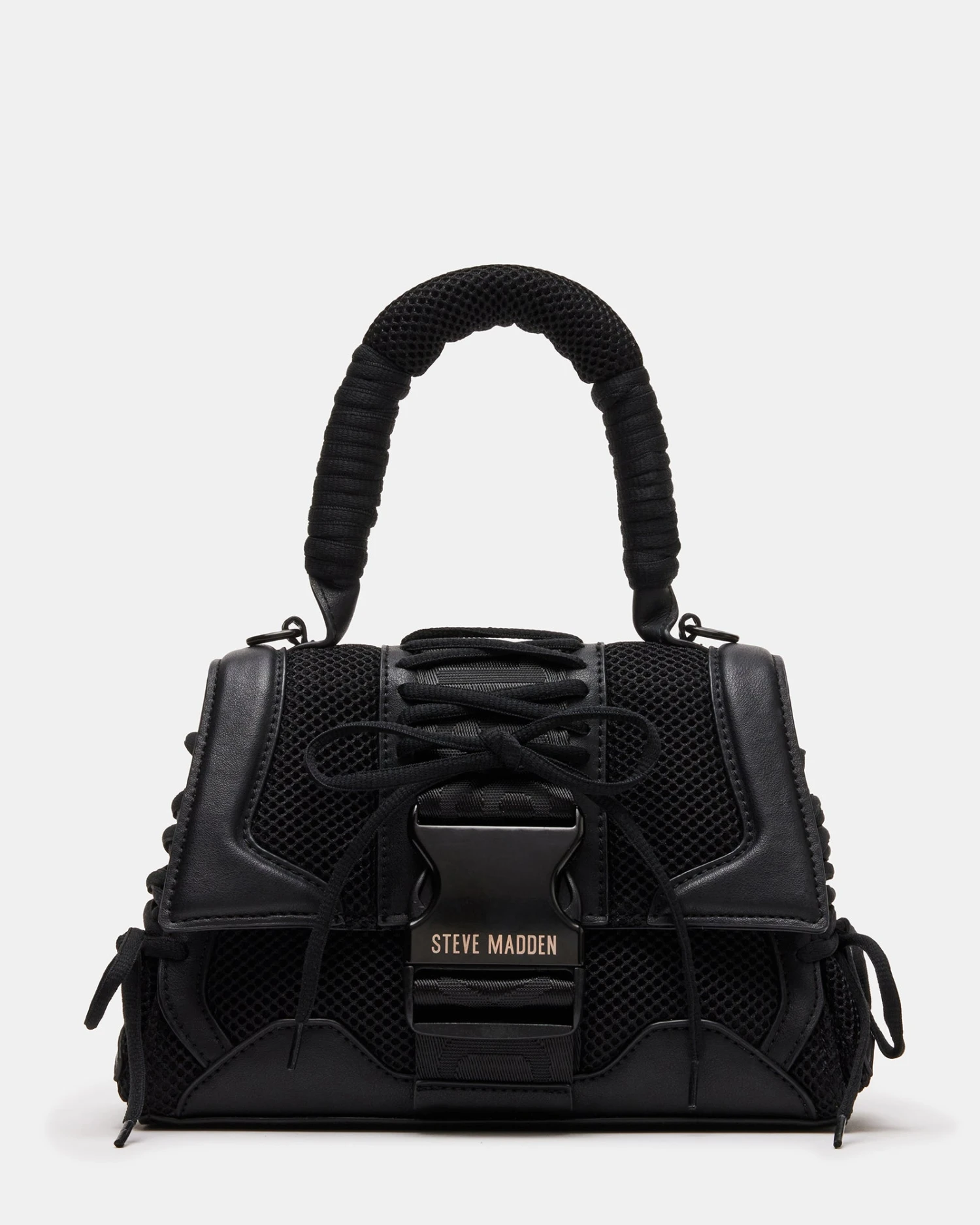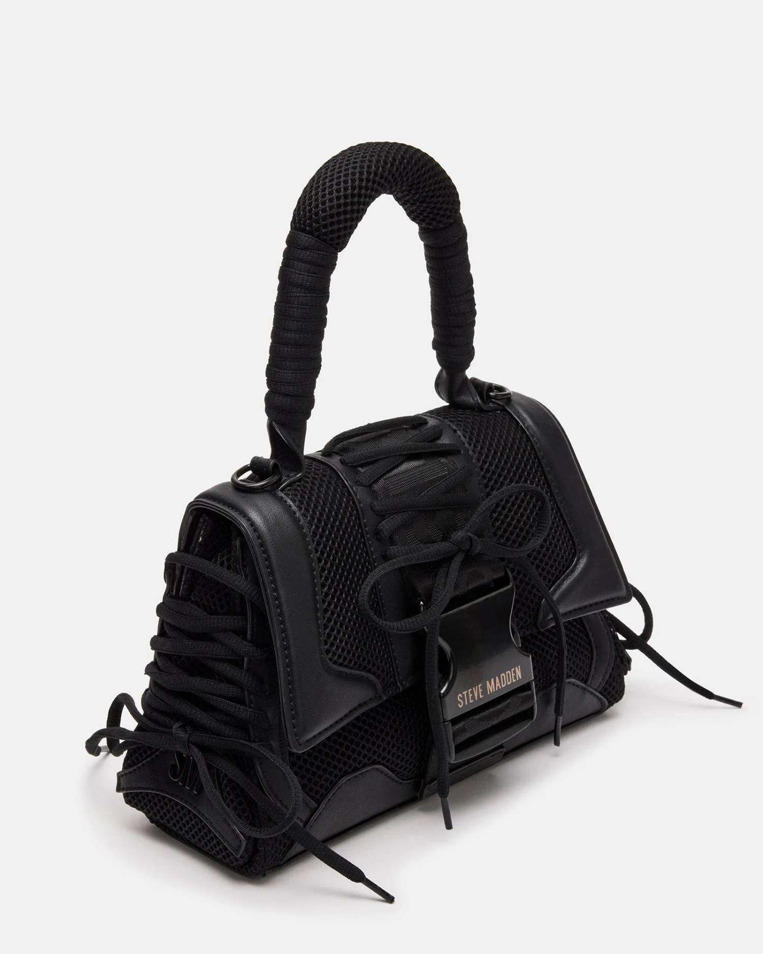The DIEGO bag is a structured trapezoid bag with athletic-inspired details like mesh overlay panels, sneaker style lacing, and an oversized quick release buckle closure.
