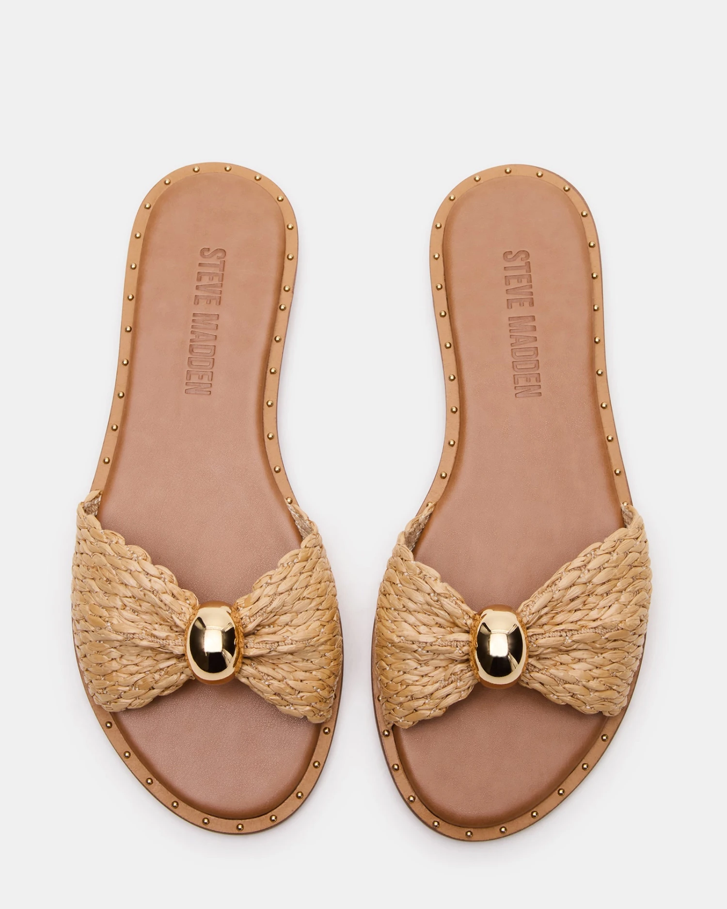 This DIPSY slide sandal features mini studs and a rounded toe for added style and comfort. The perfect combination of fashion and practicality, these sandals are a must-have for any wardrobe. With their natural raffia design, they add a touch of rustic charm to any outfit.