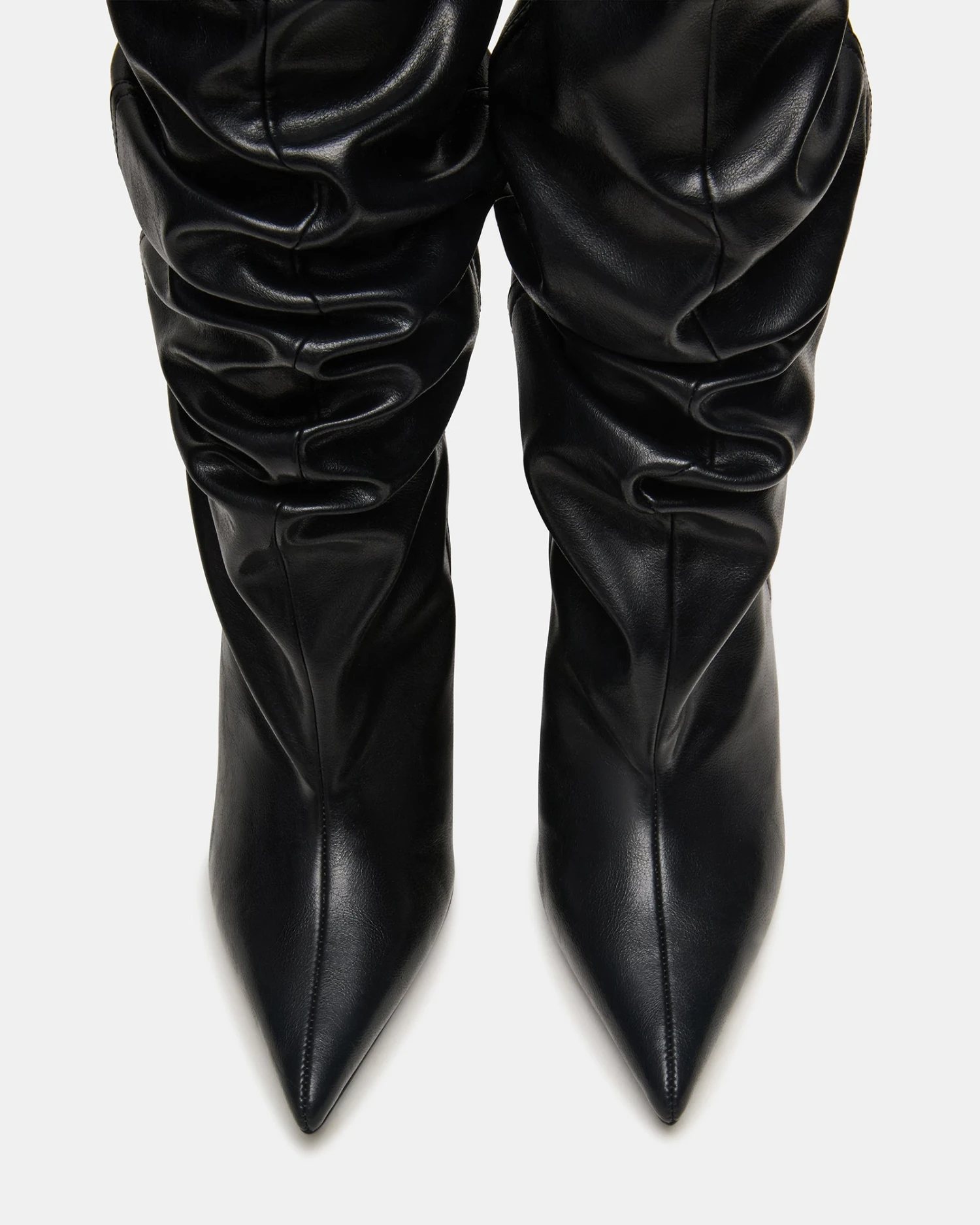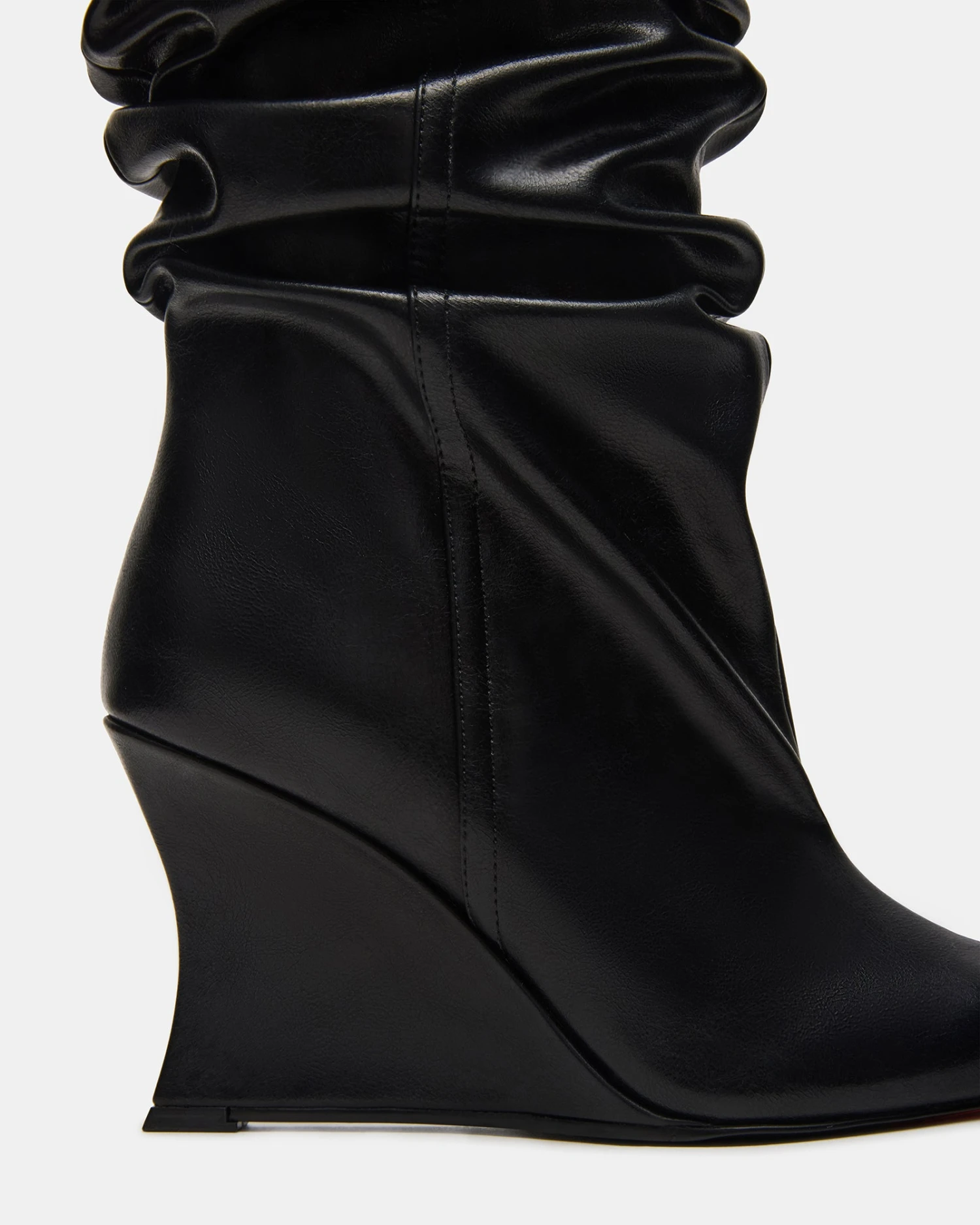 The DISTORTION boot features a scrunched design, wedge heel, and a pointed-toe, extending to knee height for a bold, fashion-forward silhouette. Crafted to combine edgy style with comfortable wear, this boot elevates any outfit with its sleek design and distinctive wedge support. Ideal for those seeking a statement piece that balances trend and practicality.