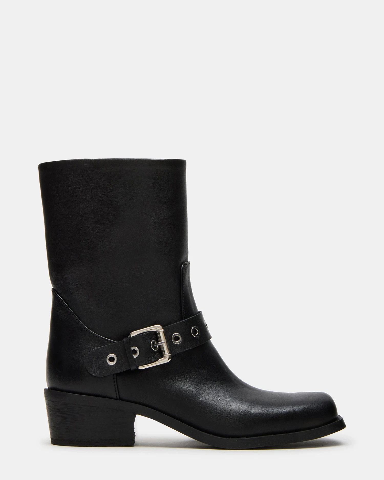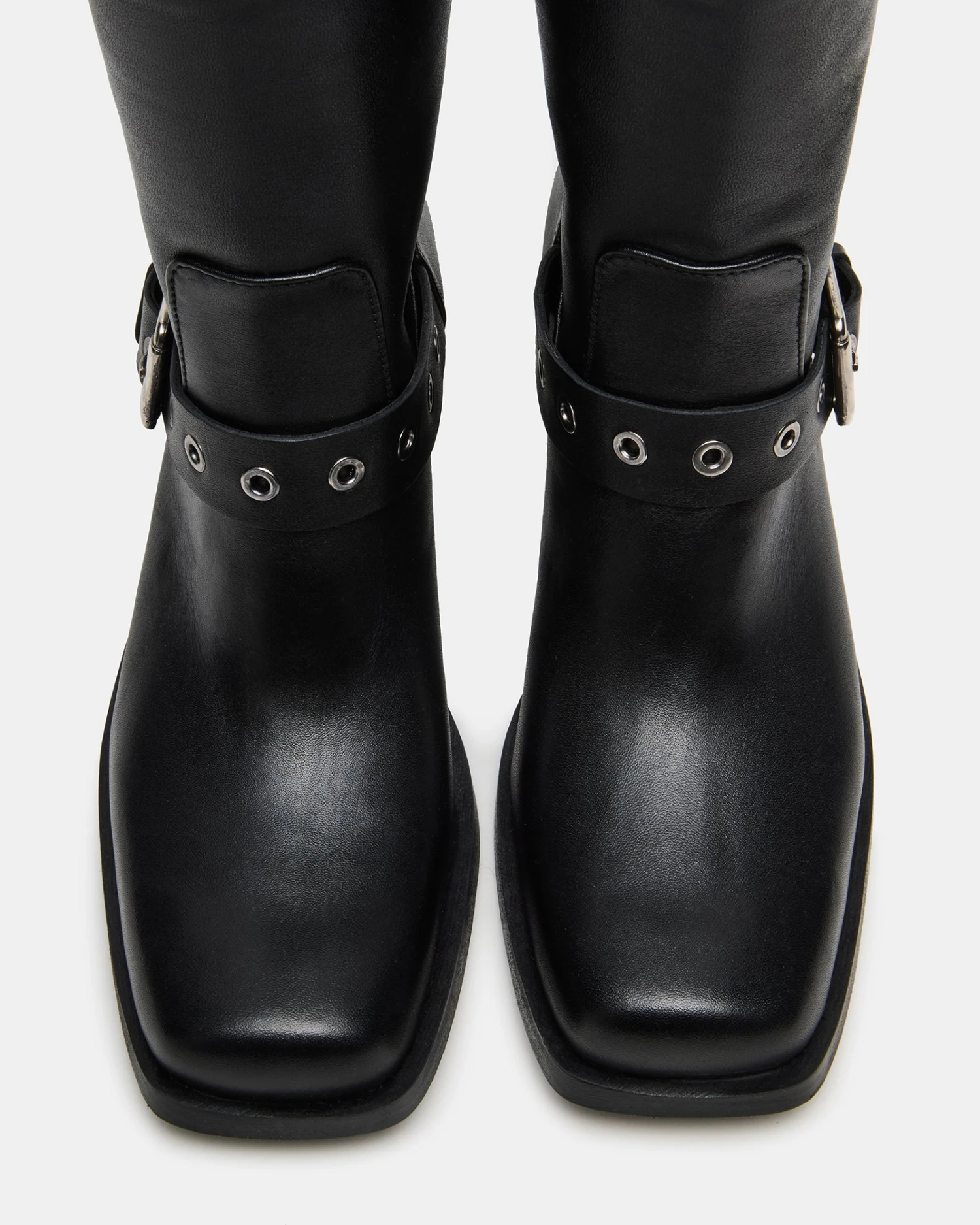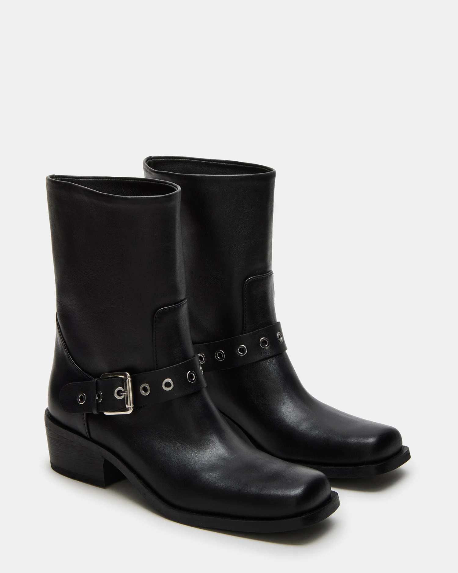 Experience sleek and edgy style with our DUSK moto square-toe boots. Designed with buckle detailing, these boots will elevate any outfit. Step into confidence with this must-have addition to your wardrobe.