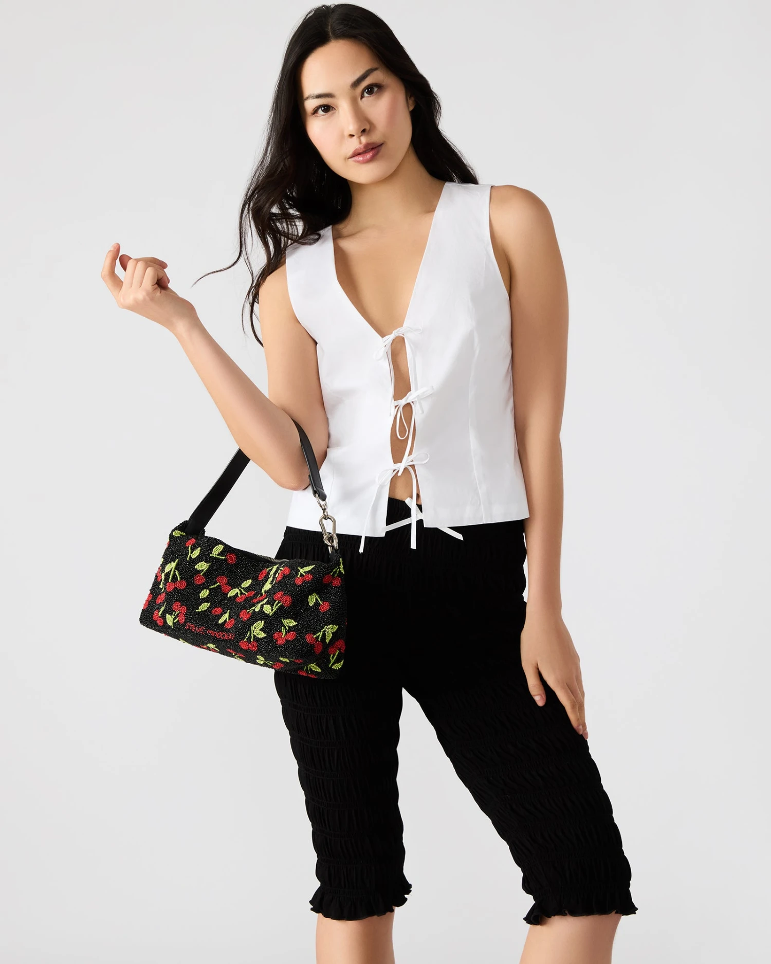 Expertly designed, the EMERSYN bag boasts fully beaded details and a cherry design beaded into the bag. With hardware to attach charms and secure zipper closure, this bag also features a back wall zipper pocket for additional storage. Exude style and functionality with this chic accessory.