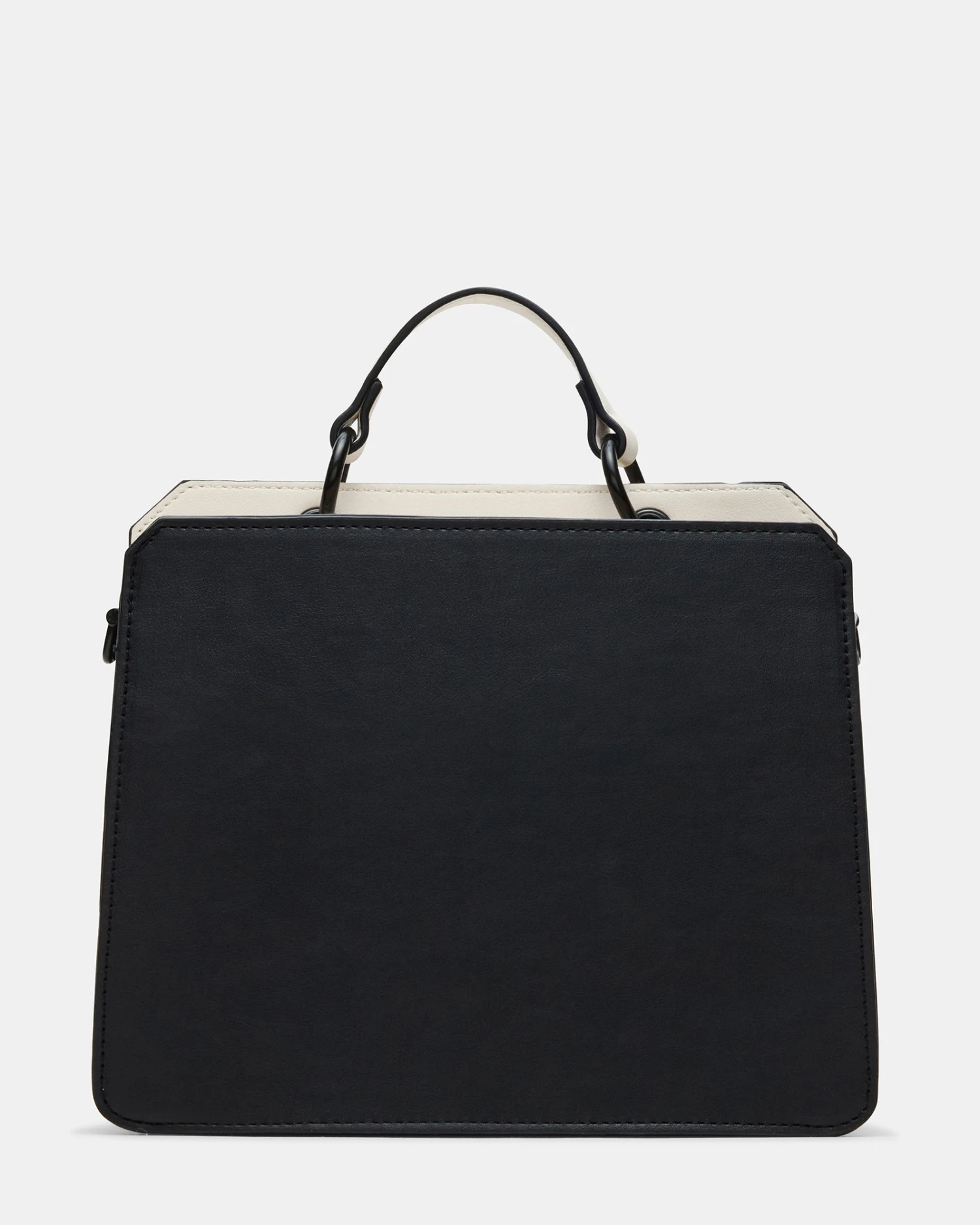 Clever interior organization and a matching pouch give the compact EVELYN BAG BLACK/MULTI surprisingly roomy storage. Reinforced edges, structured side gussets, and custom hardware add to the substantial look and feel of this top-handle design.