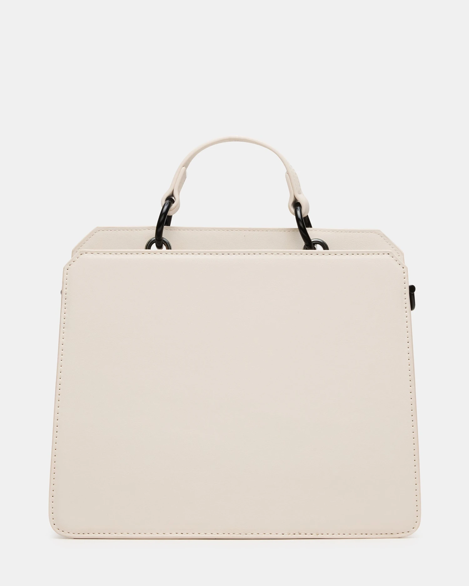 Clever interior organization and a matching modular zip pouch give the compact EVELYYN BAT BAG CHALK surprisingly roomy storage. Reinforced edges, structured side gussets, and custom hardware add to the substantial look and feel of this top-handle design.