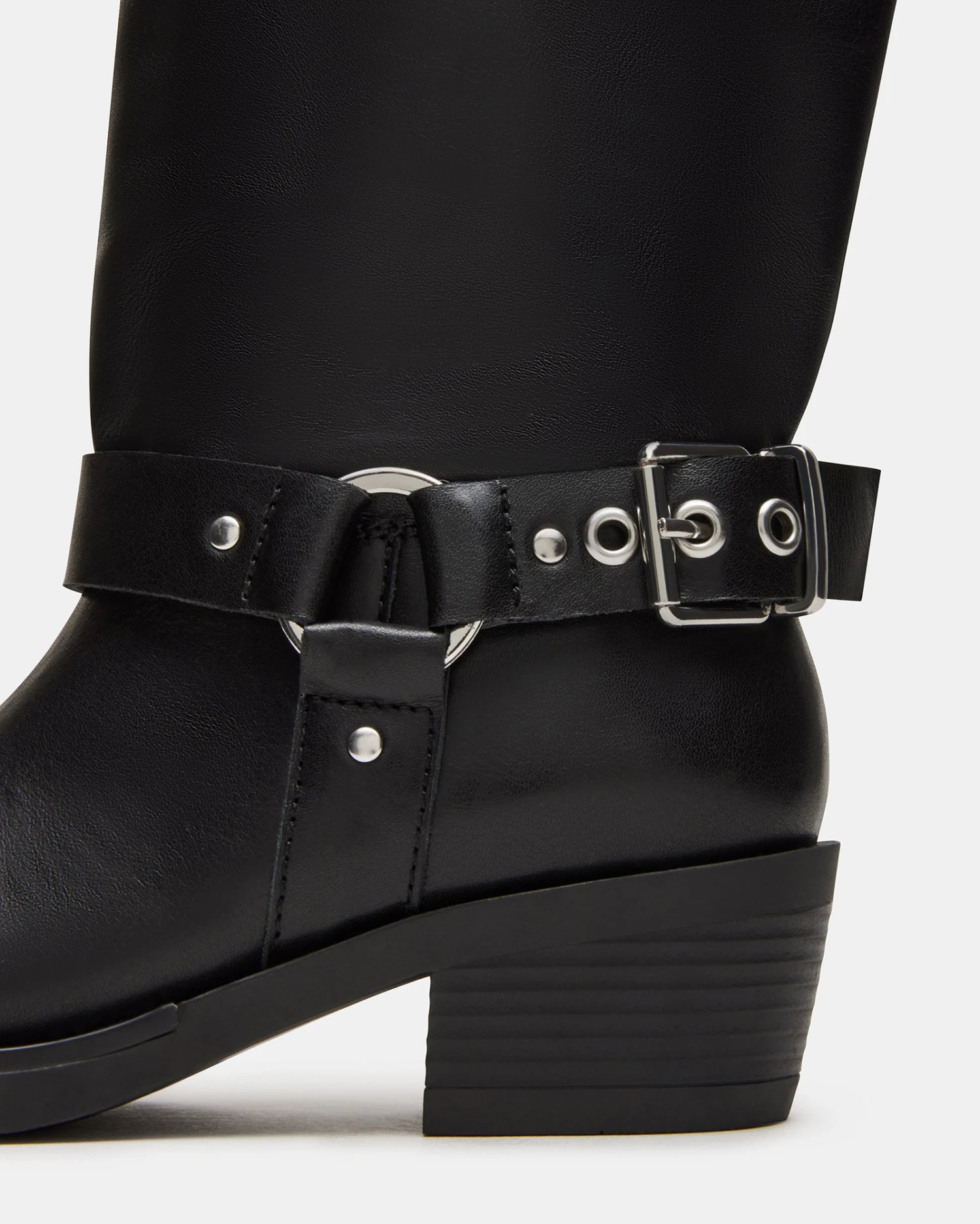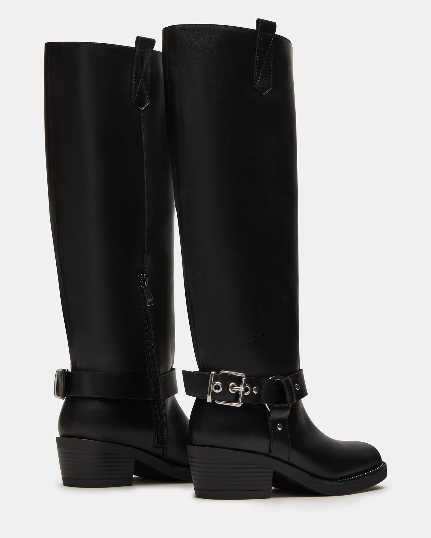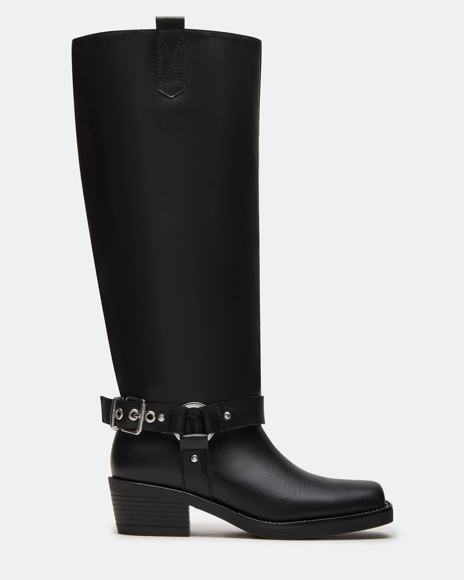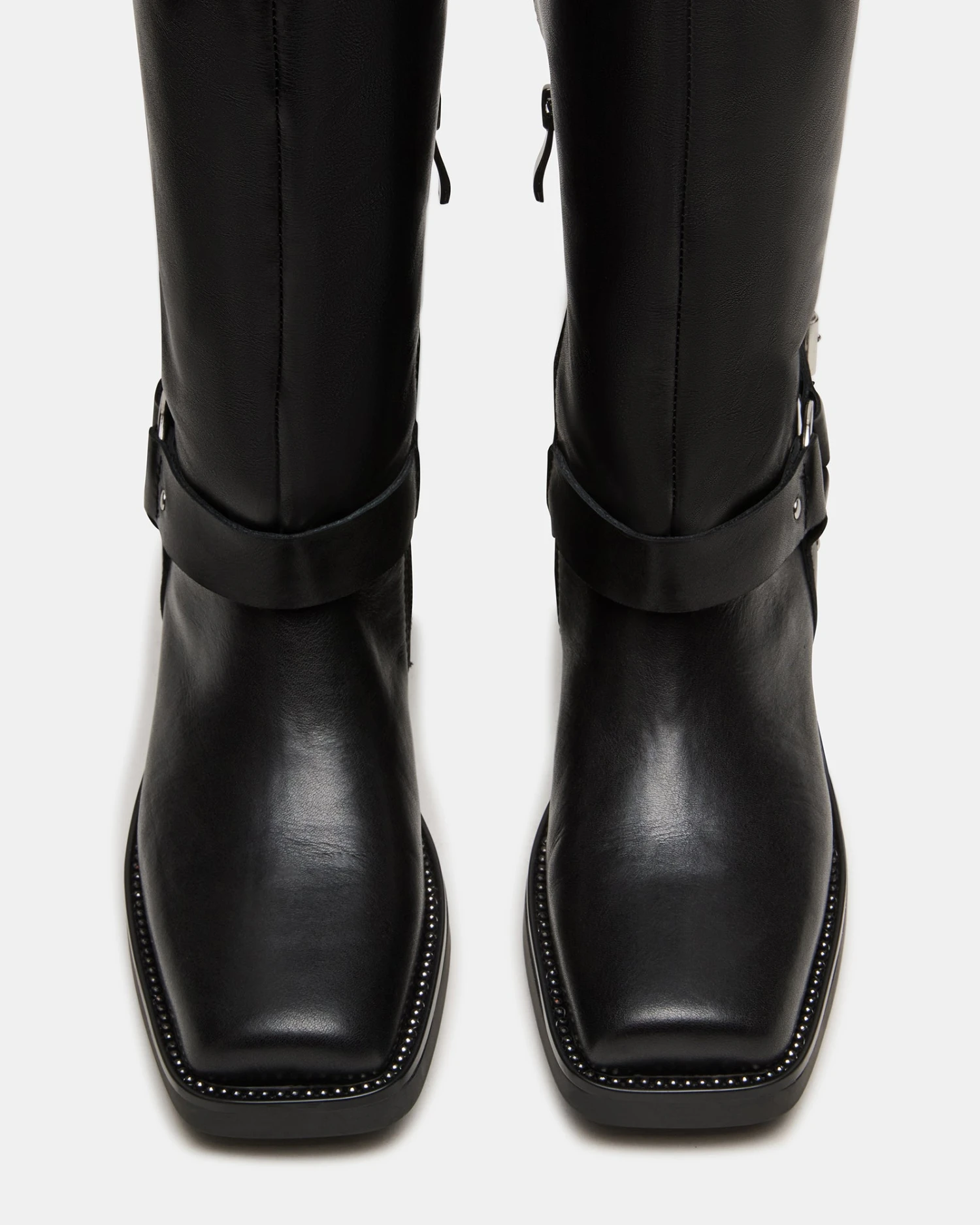 Upgrade your style with these HAWKINS moto boots. Featuring a sleek knee-high design and edgy buckle detail, these boots are the perfect combination of fashion and functionality. The square toe adds a modern touch, making these boots a must-have for any fashion-forward individual.