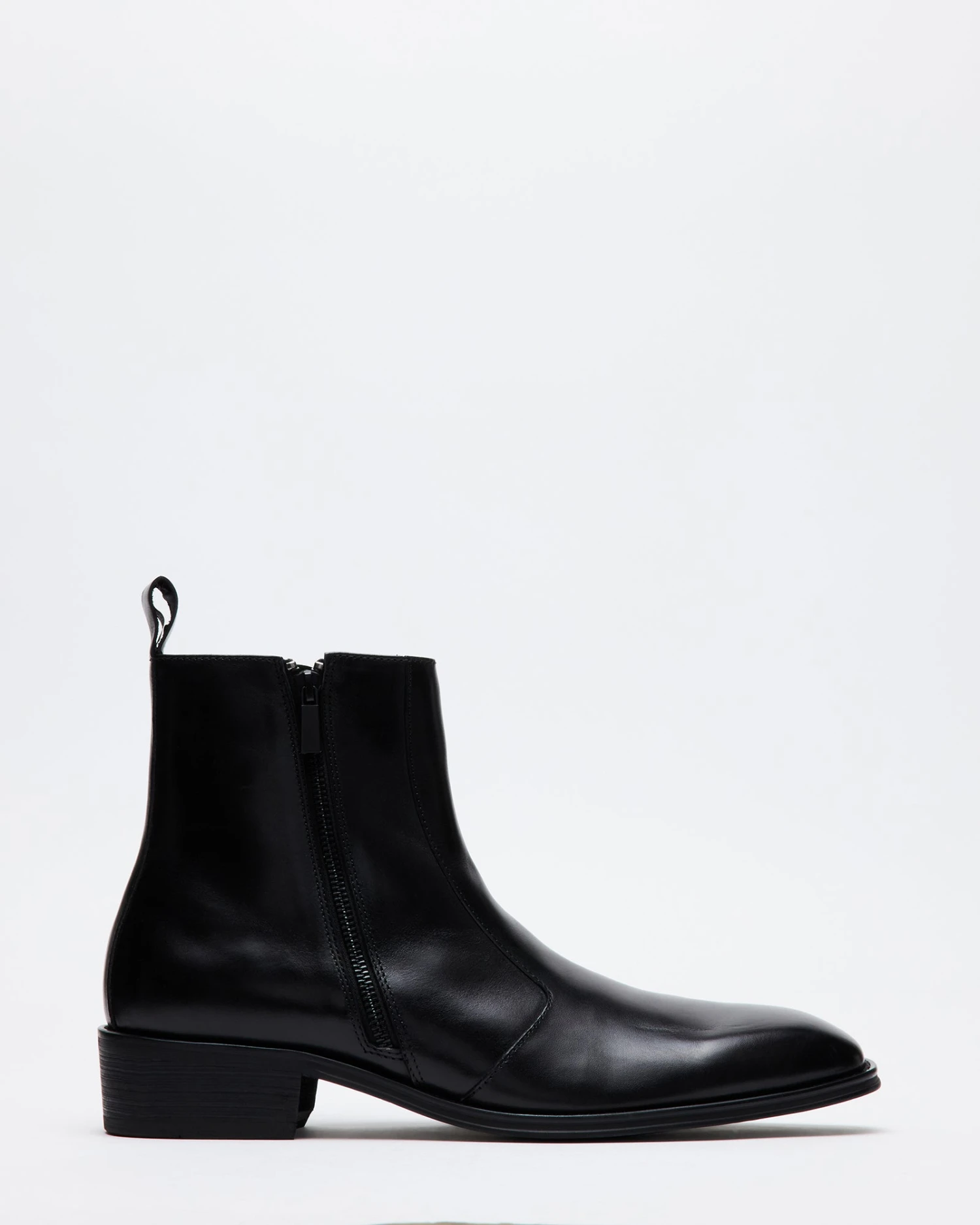A double zipper design, a block heel, and a smooth front give the HAYNES dress boot its clean look and sharp, defined silhouette.
