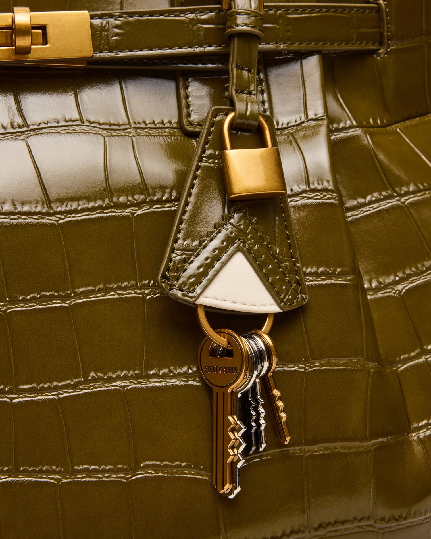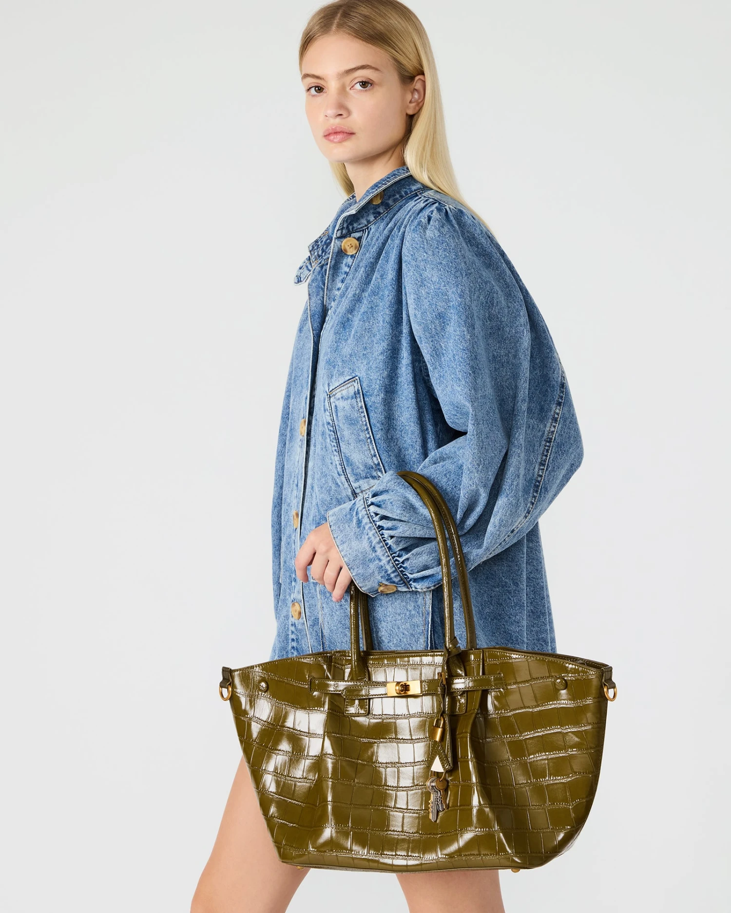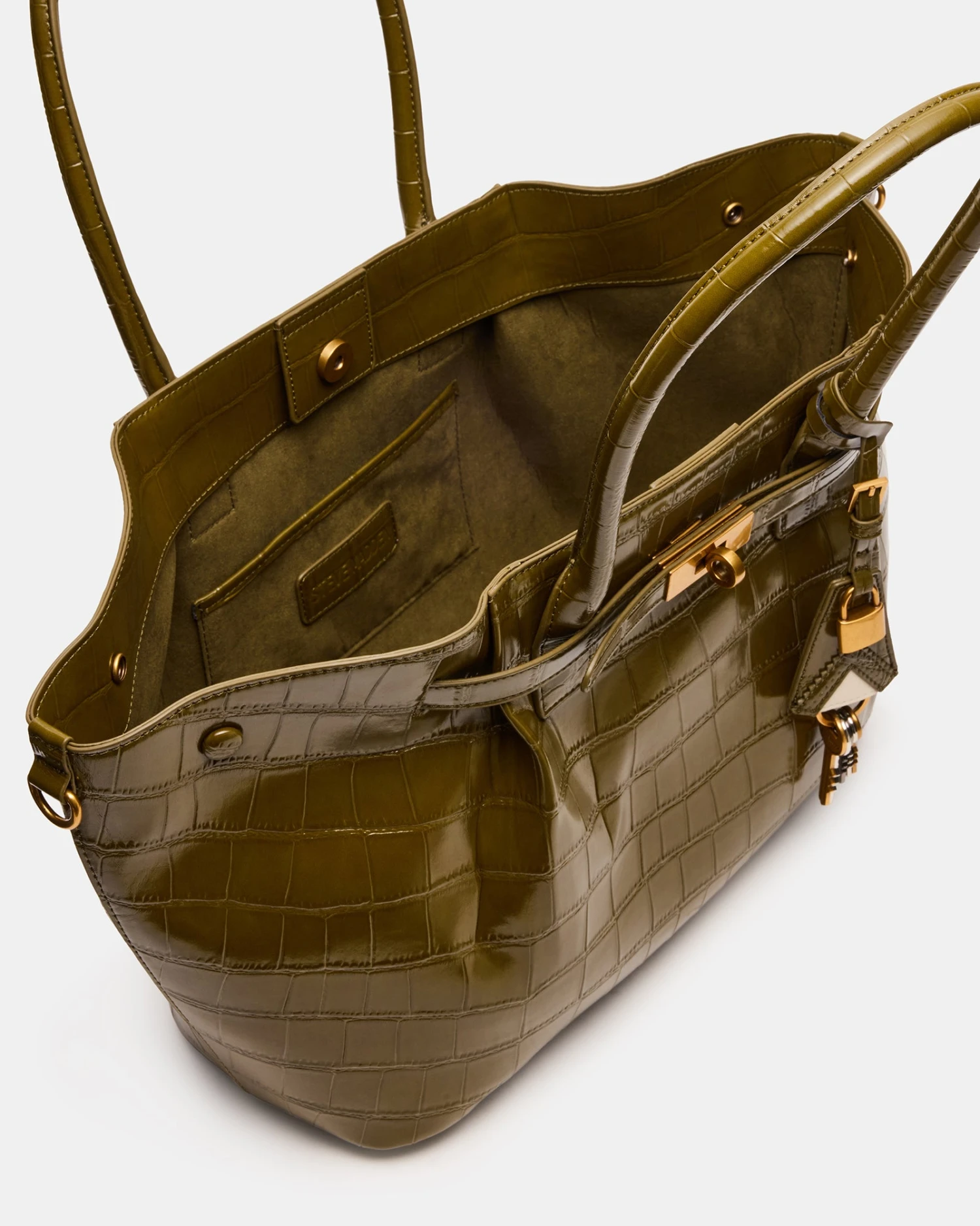 The KACEY BAG OLIVE tote combines spacious design with sophisticated security features. Crafted for everyday use, this large tote includes elegant padlock and key bag charms that add a refined touch while emphasizing security. Its ample interior accommodates all essentials, making it ideal for both work and leisure, seamlessly blending functionality with style.
