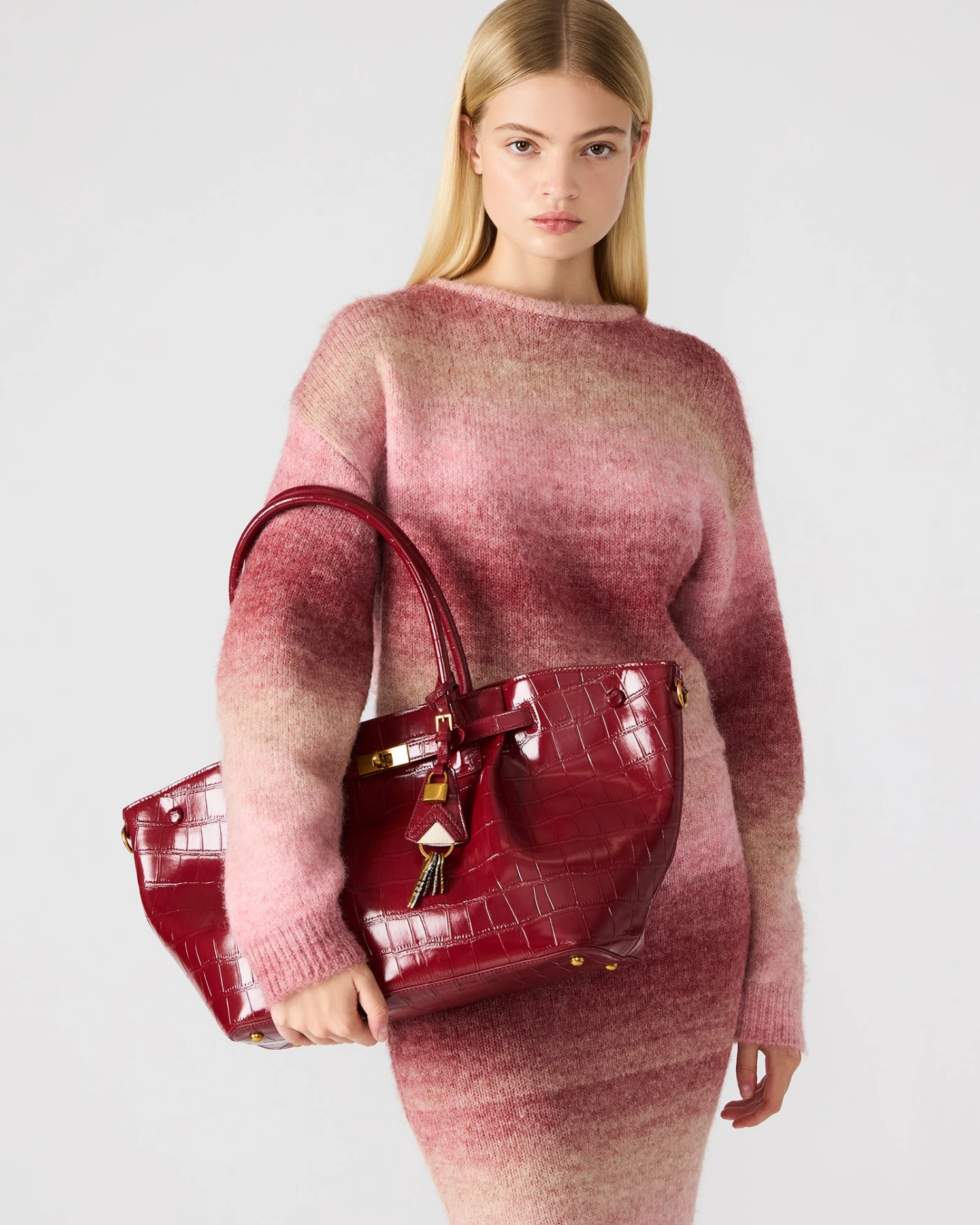 The KACEY BAG RED tote combines spacious design with sophisticated security features. Crafted for everyday use, this large tote includes elegant padlock and key bag charms that add a refined touch while emphasizing security. Its ample interior accommodates all essentials, making it ideal for both work and leisure, seamlessly blending functionality with style.