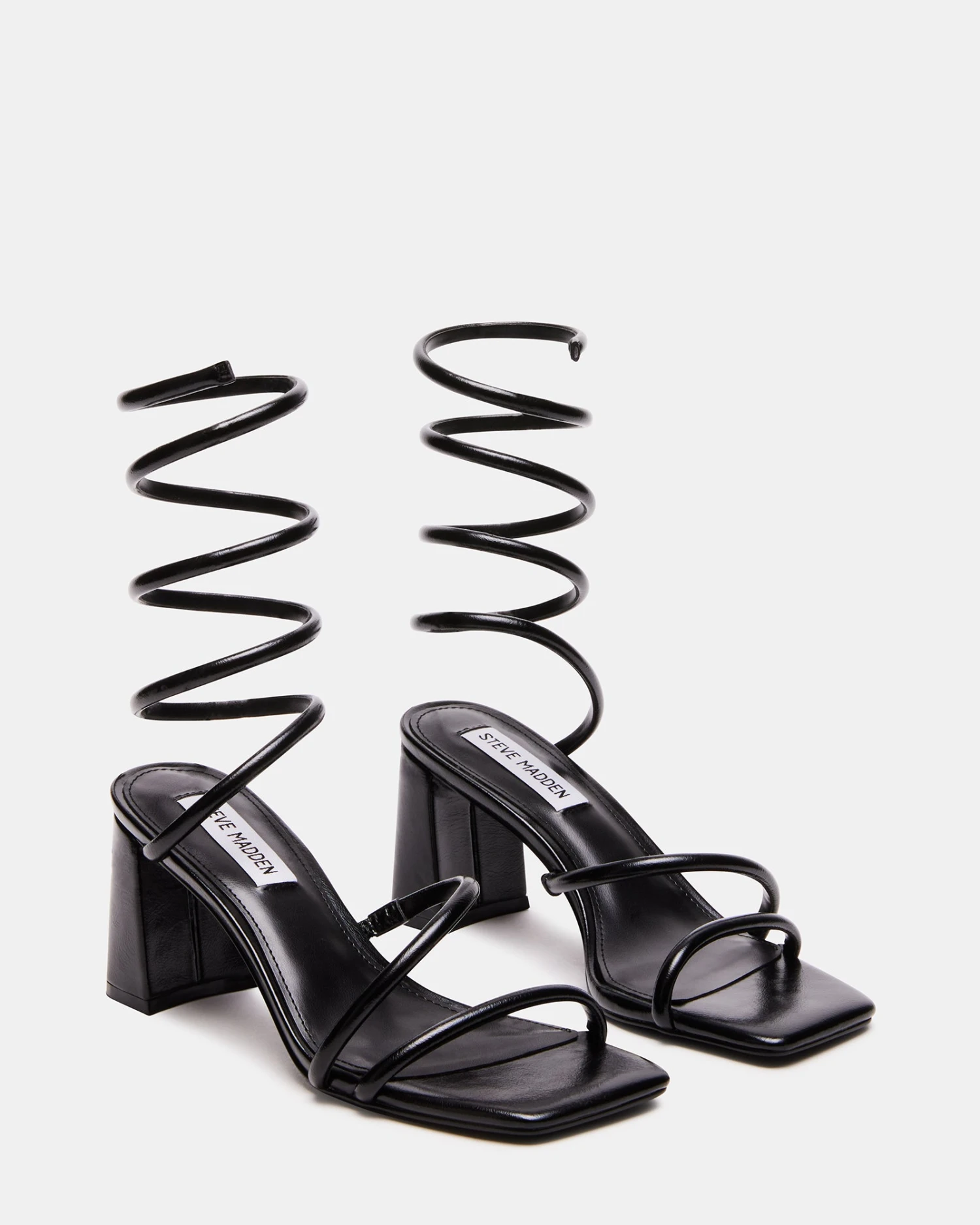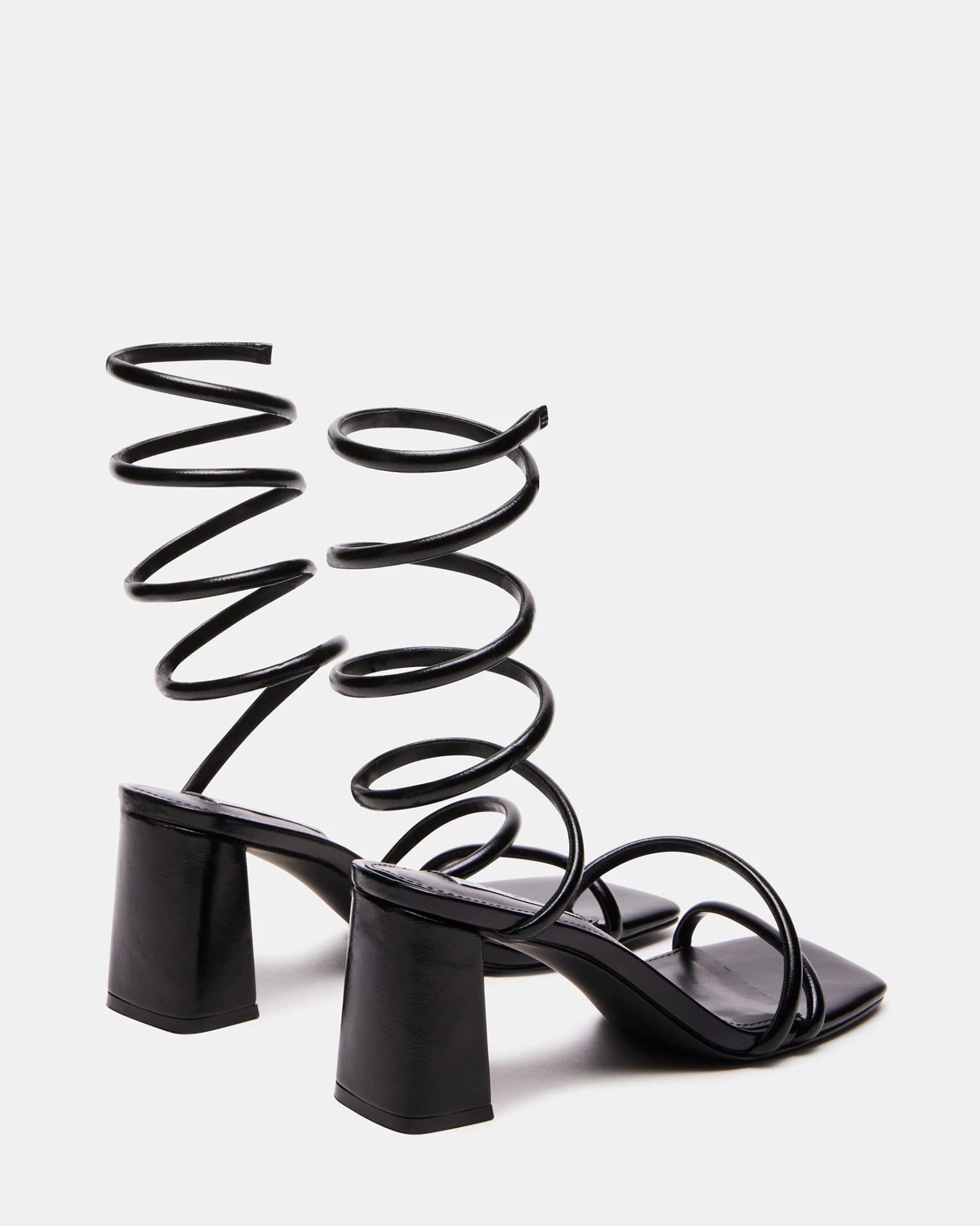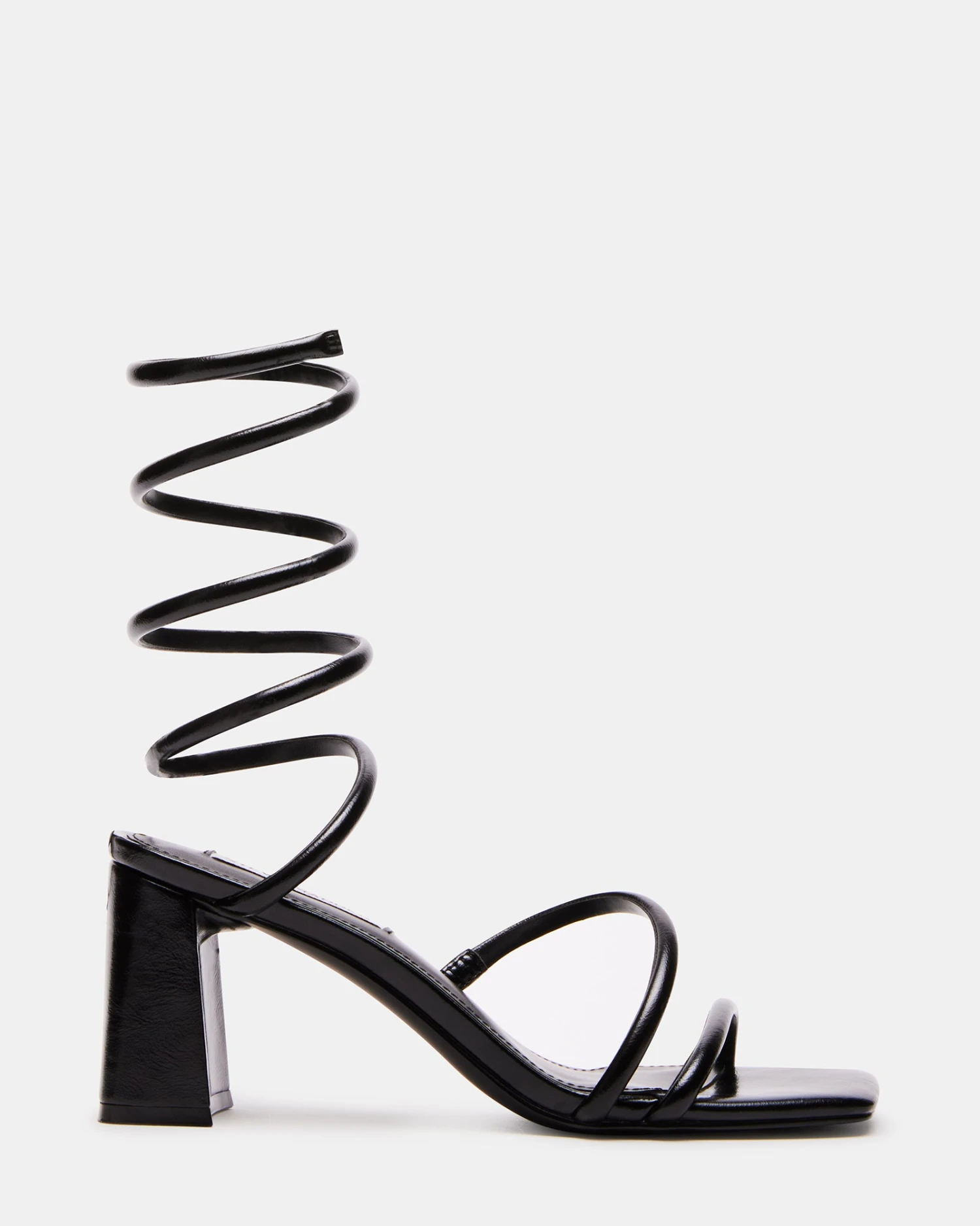 Dimensional tubular straps crossed over the foot and coiled around the ankle secure the LOPEZ sandal to a square toe sole with a block heel.