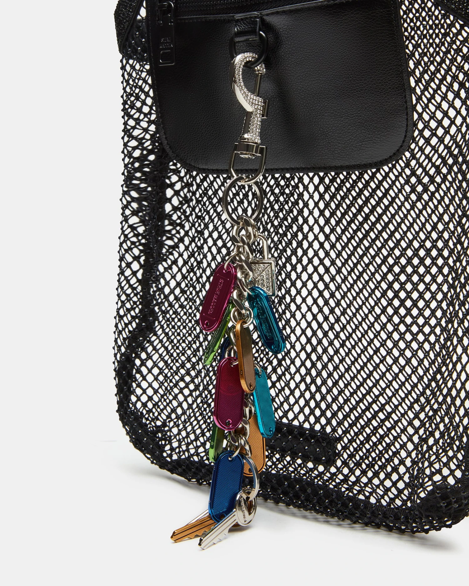 This MAKIA bag is a stylish and functional accessory for any occasion. The crystal rhinestone shoulder strap adds a touch of glamour, while the additional pocket with zipper closure provides secure storage. The curb chain bag charm with a padlock charm and textured key tag charms gives the bag a unique and trendy look. Stay organized and chic with this must-have net bag.