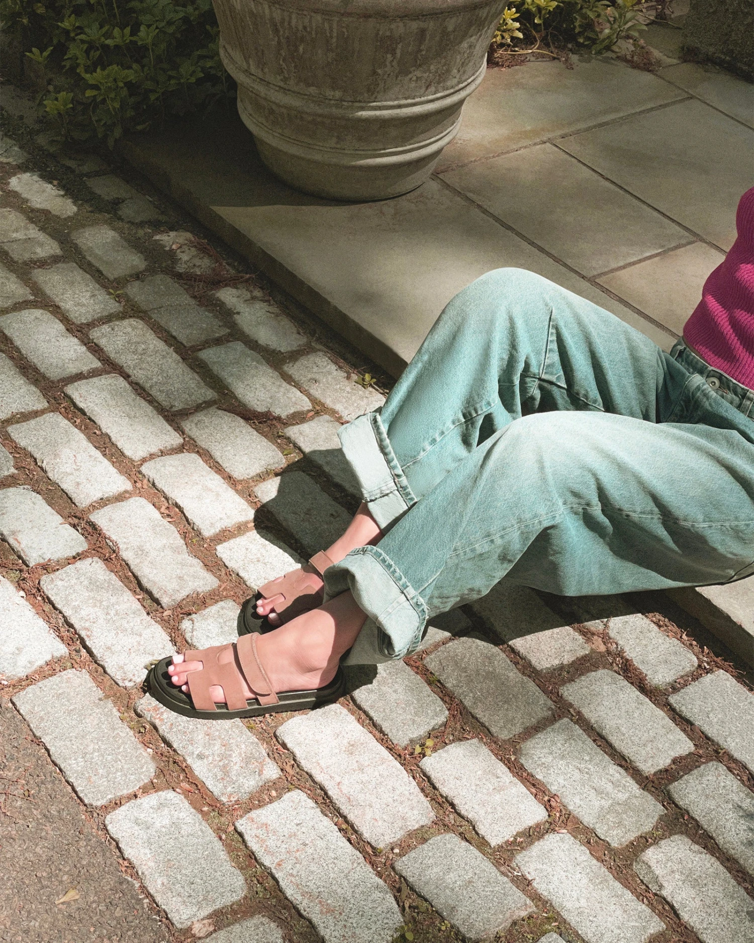 The leather MAYVEN slides feature comfy construction details like a molded footbed, a treaded flatform sole, and an adjustable top strap, plus a front strap with a geometric cutout design.