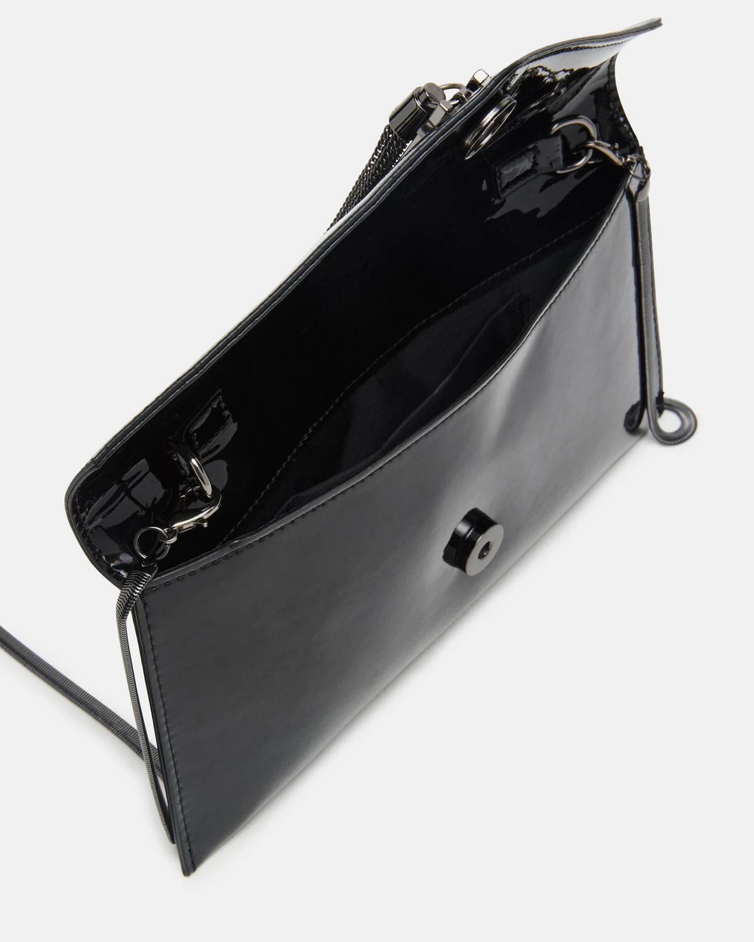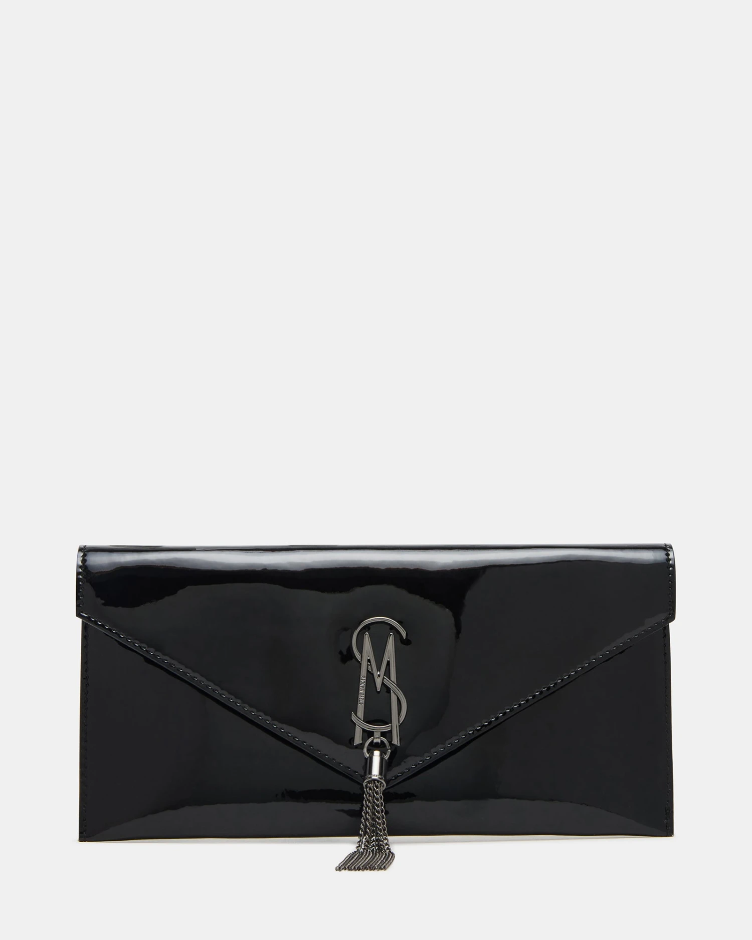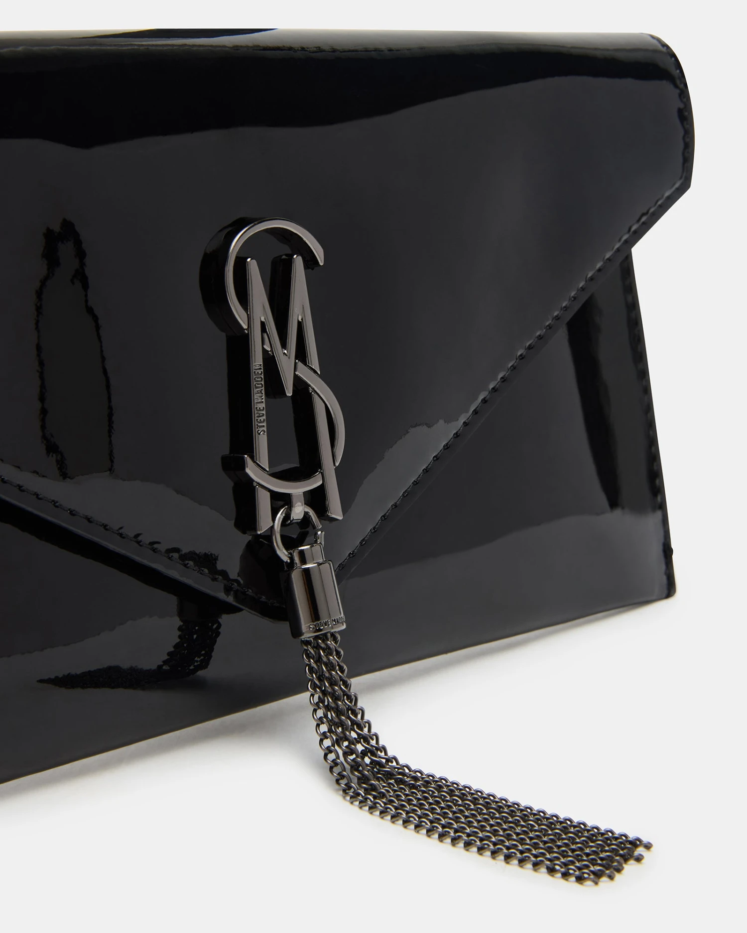 Expertly crafted in sleek black patent, the MORGANA bag offers both style and functionality. With its envelope design and magnetic snap closure, this clutch handbag is perfect for a night out. The interior includes a zipper wall and has enough room to fit a large phone. Finished with a chain tassel featuring the logo, it’s a must-have accessory.