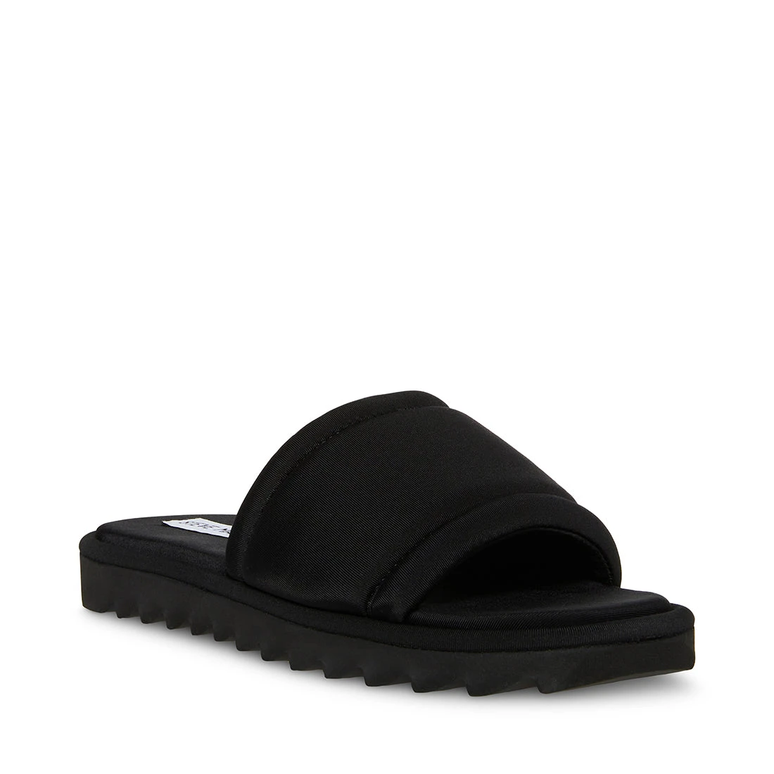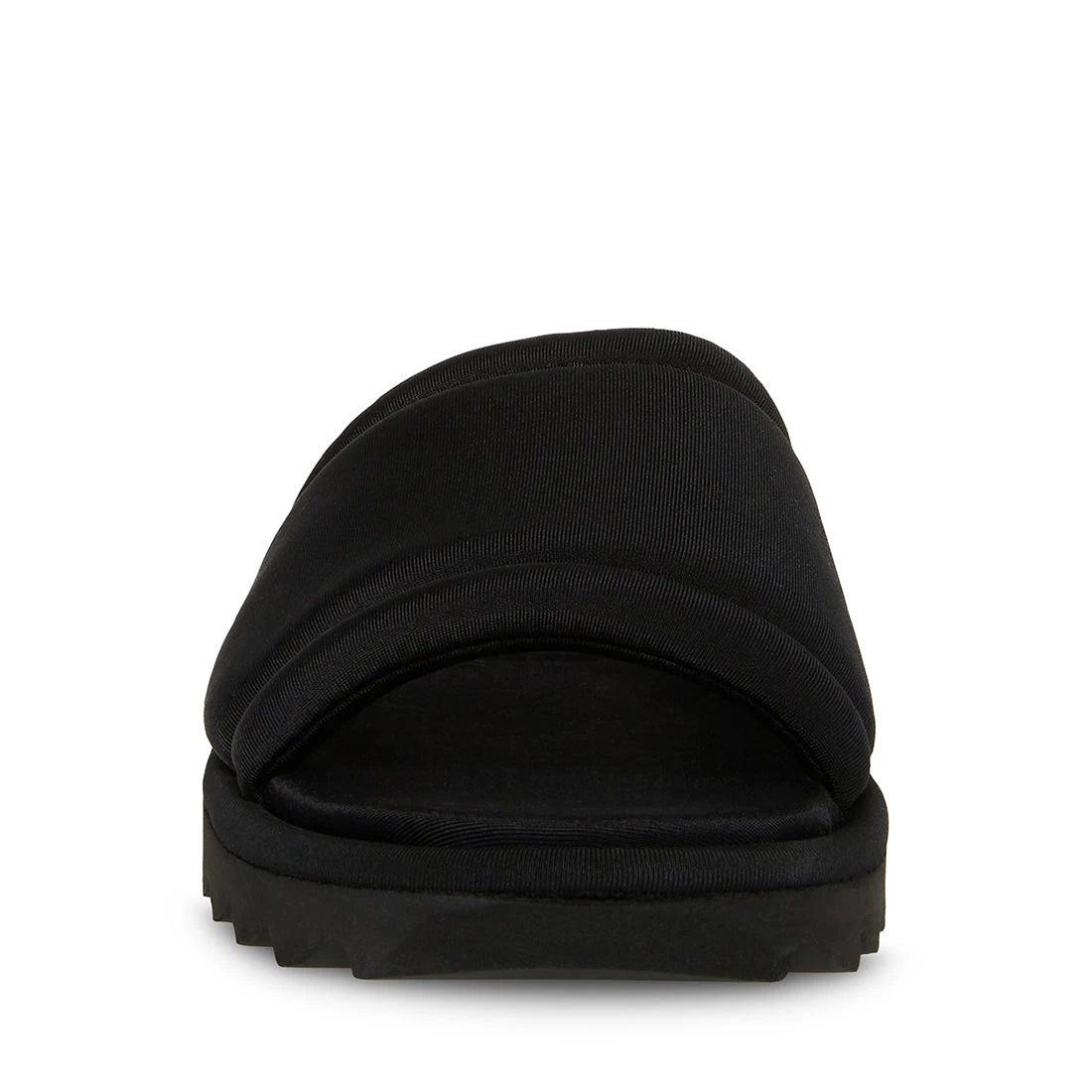 A wide padded fabric strap and a low flat platform add structure to the MOXIE slides.
