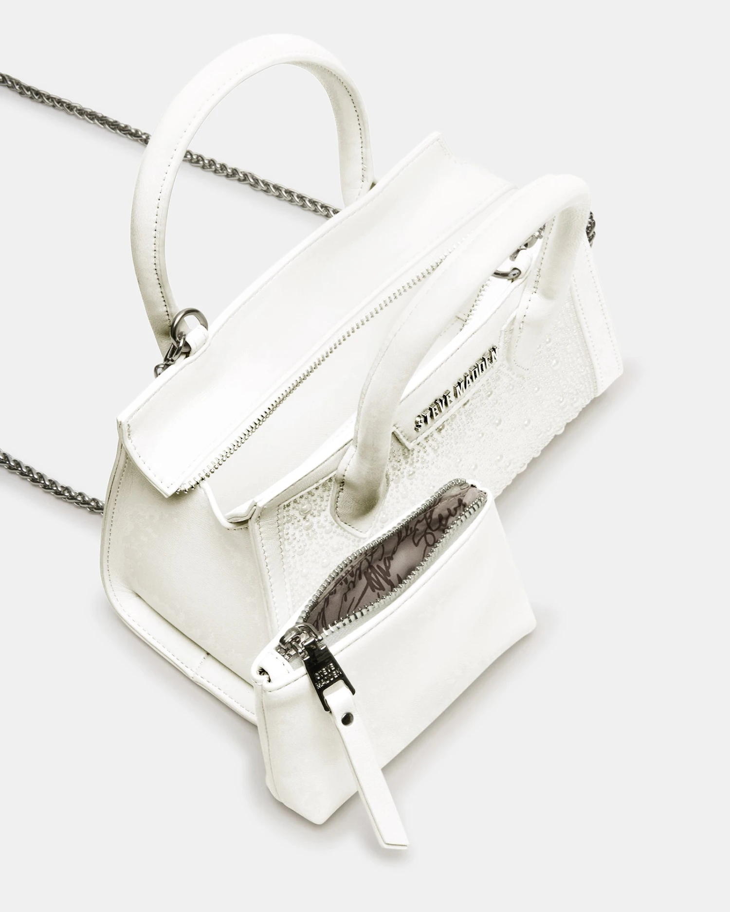 The PEACHY bag is a mini top-handle bag that combines style and functionality. Its unique design adds a touch of elegance, while the detachable chain crossbody strap offers versatile carrying options. The top zipper closure keeps your essentials secure, and the all-over mesh design adds a unique touch. Elevate your outfit with this must-have accessory.