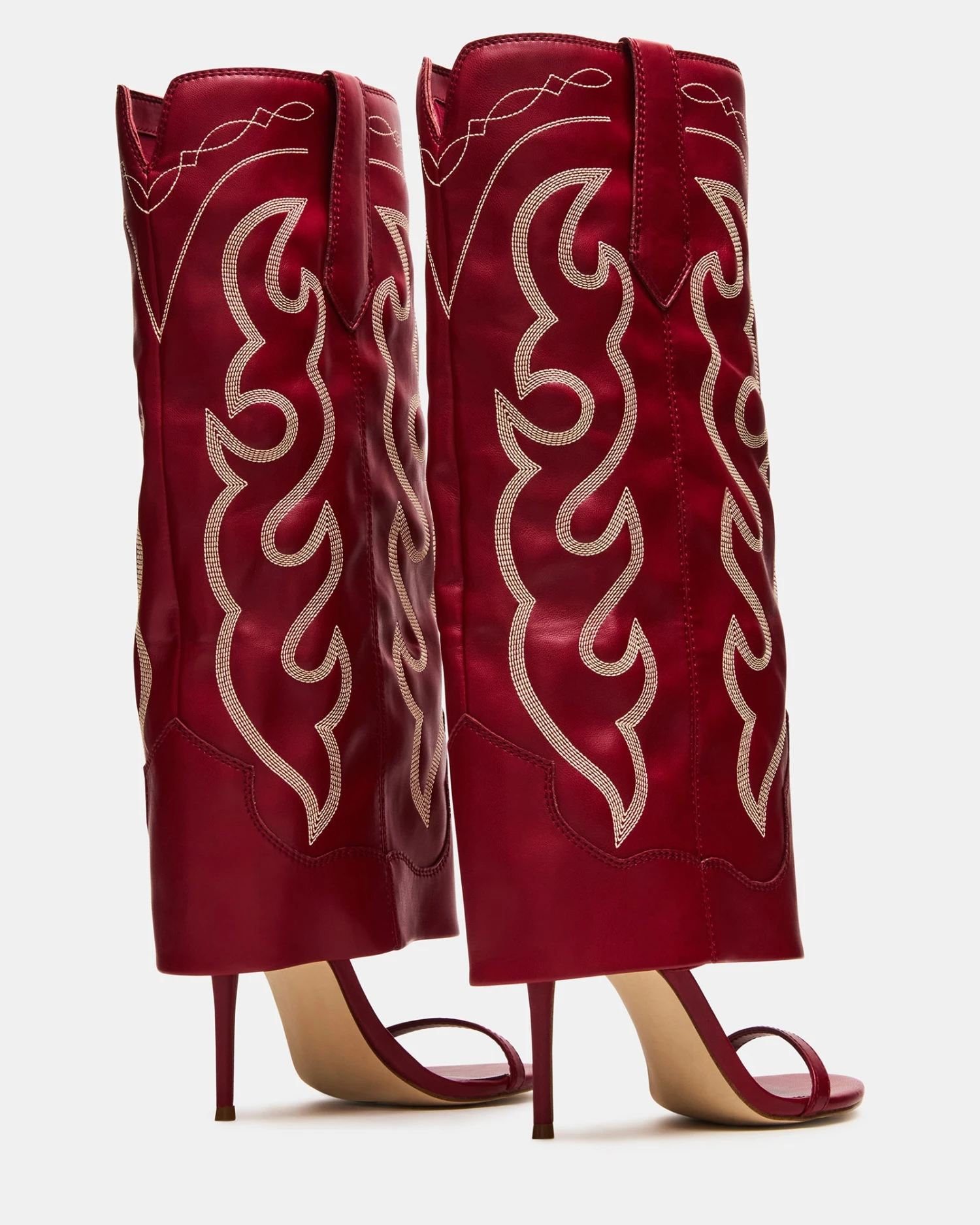 Expertly crafted and designed, the RAVINE WESTERN RED cuffed knee-high boot features an open toe and stiletto heel for a stylish touch. The rounded toe provides comfort while the sleek design adds a touch of sophistication. Elevate your look with this must-have boot.