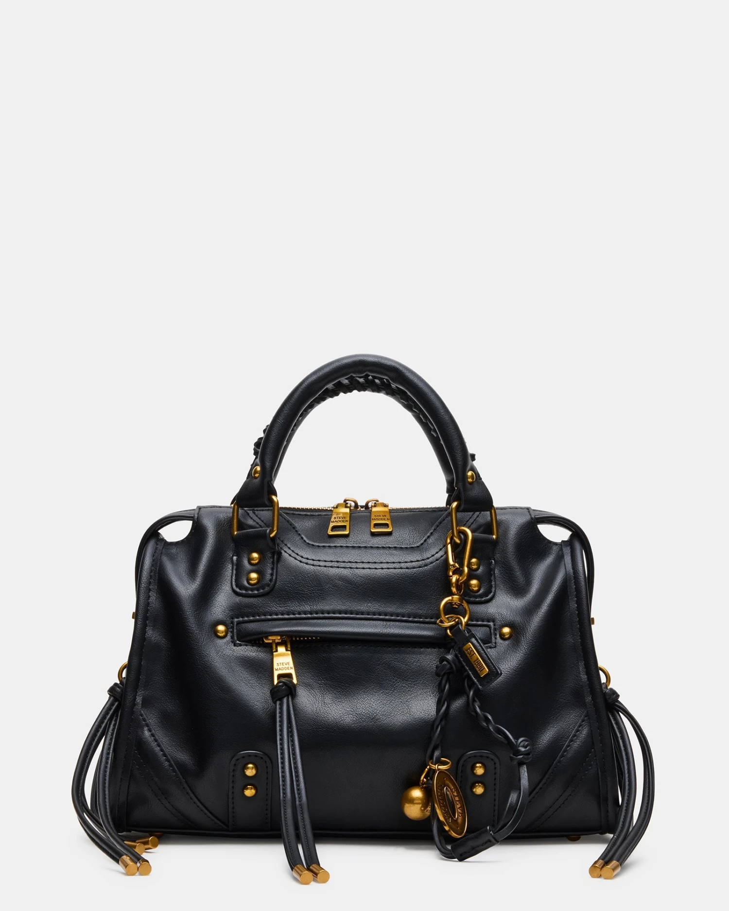 Expertly crafted with a slouchy satchel design, this RIGGS bag is a top-handle bag that combines style and function. Featuring dome stud details and knotted fringe decals on a gusset with rounded bottom metal aglets, it also comes with an attachable crossbody strap for versatile wear—a must-have for any fashion-forward wardrobe.