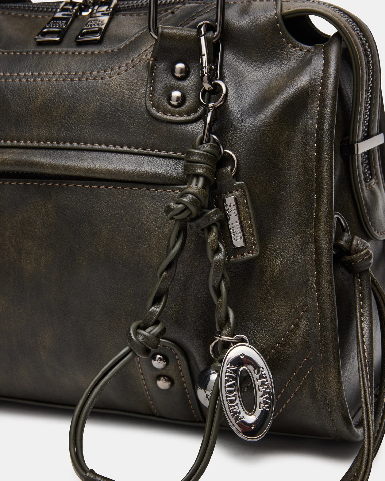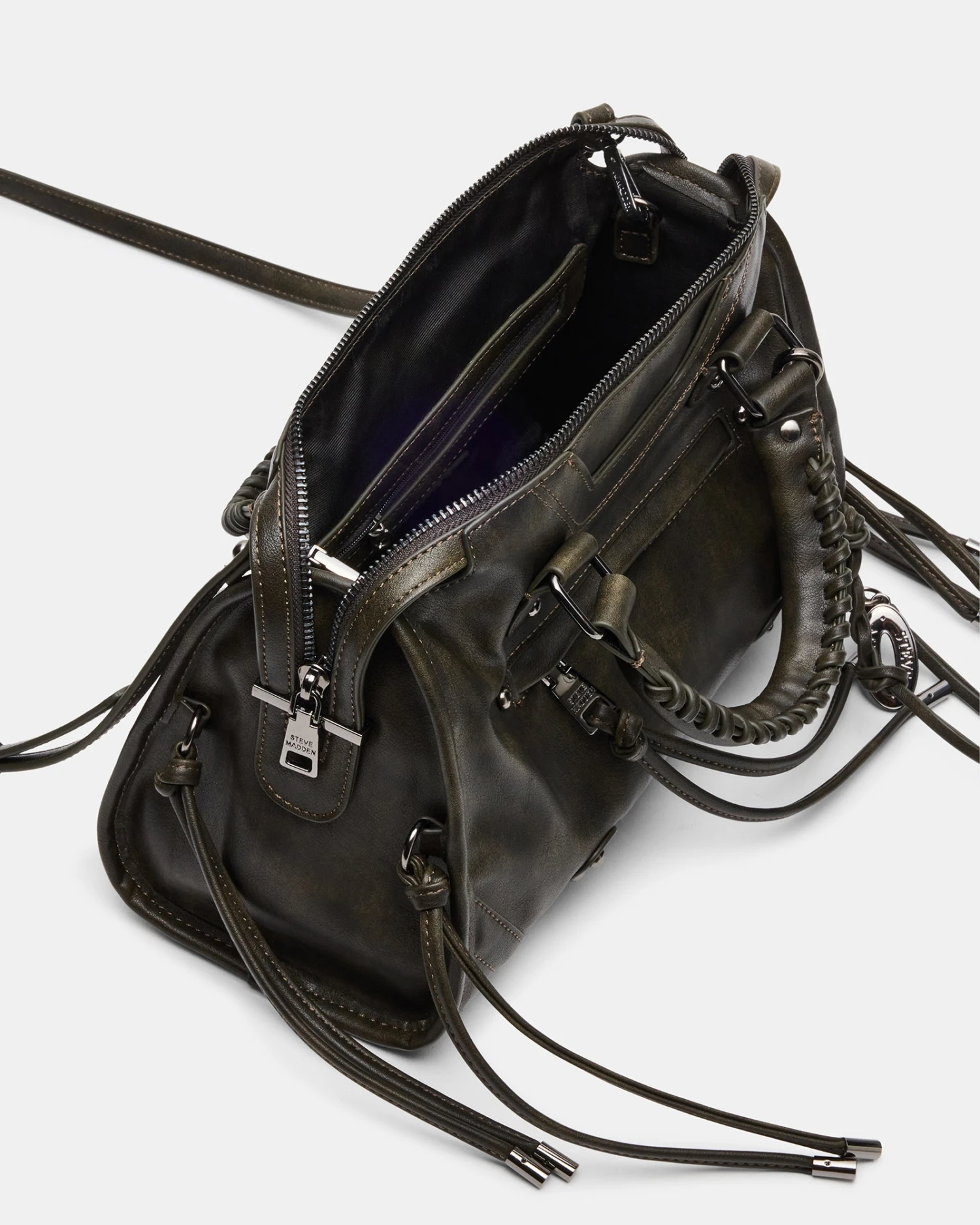 Expertly crafted with a slouchy satchel design, this RIGGS bag is a top-handle bag that combines style and function. Featuring dome stud details and knotted fringe decals on a gusset with rounded bottom metal aglets, it also comes with an attachable crossbody strap for versatile wear—a must-have for any fashion-forward wardrobe.