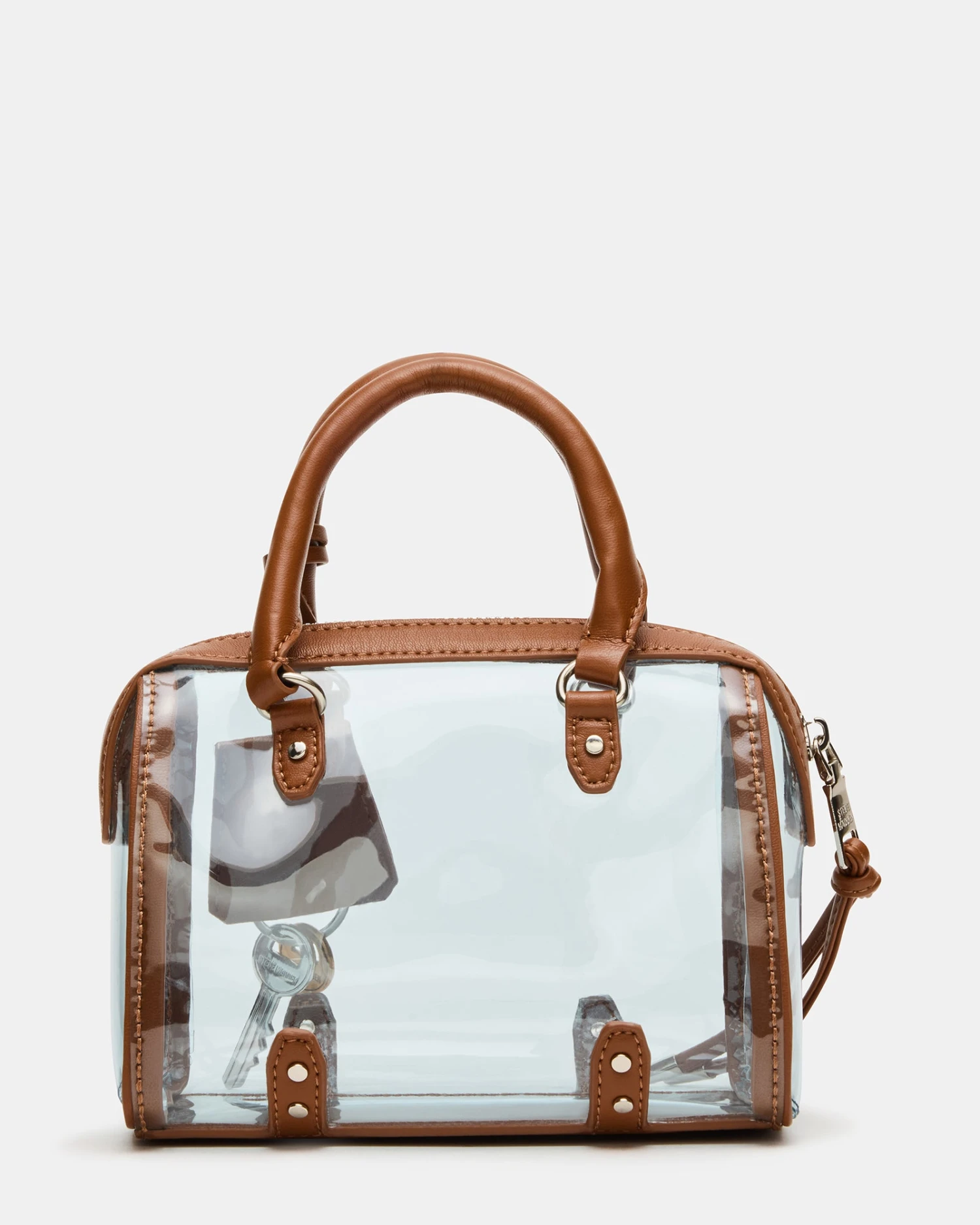 The RIVAL bag is a sleek mini clear crossbody designed to meet stadium requirements, ensuring hassle-free entry. Featuring convenient top-handles, it offers versatile carrying options for both hands-free and handheld use. Its compact size keeps essentials organized while maintaining a modern, minimalist look perfect for events and everyday outings.